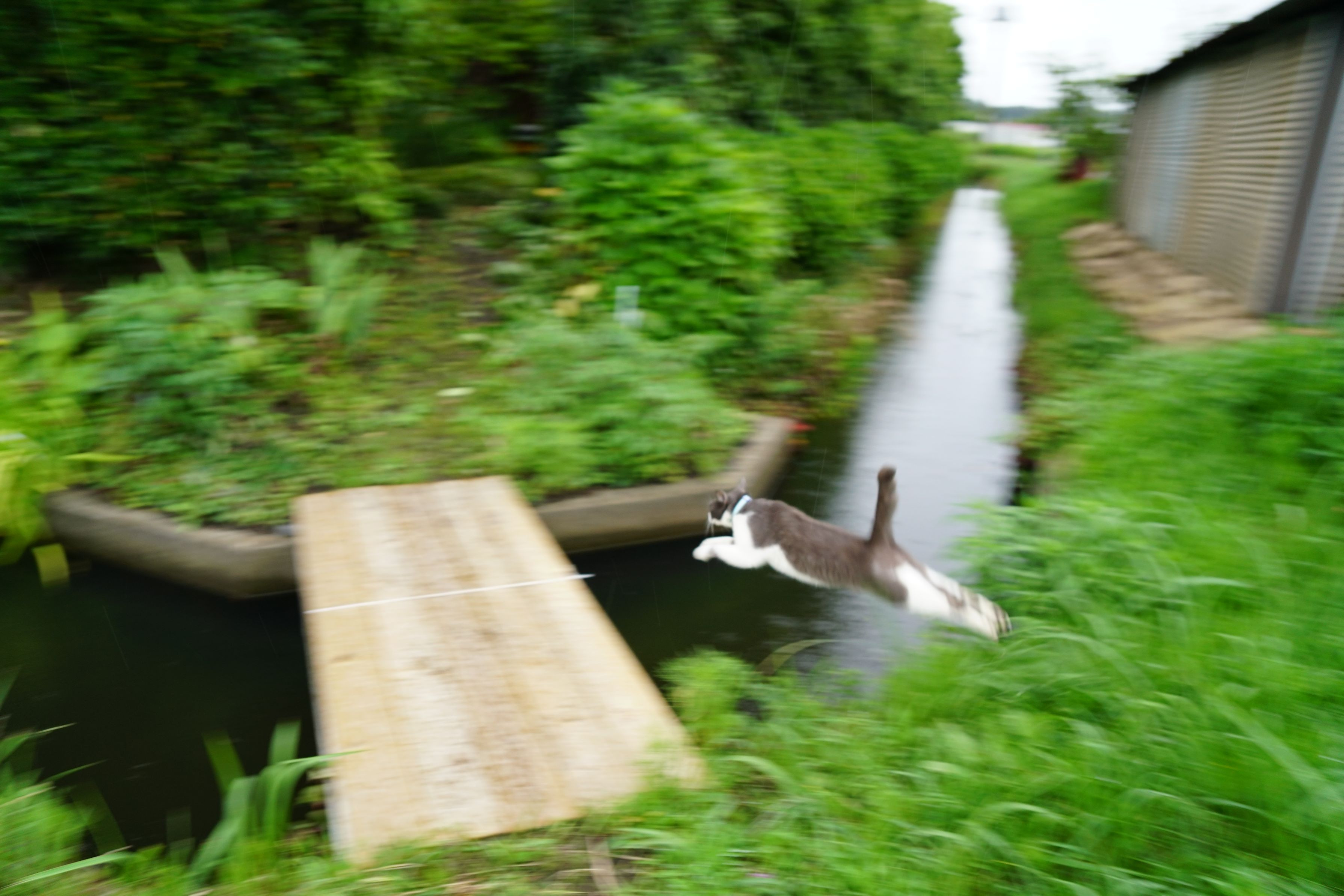 雨上がり。濡れるのが嫌で草むらで跳ねまくる我が家の猫。