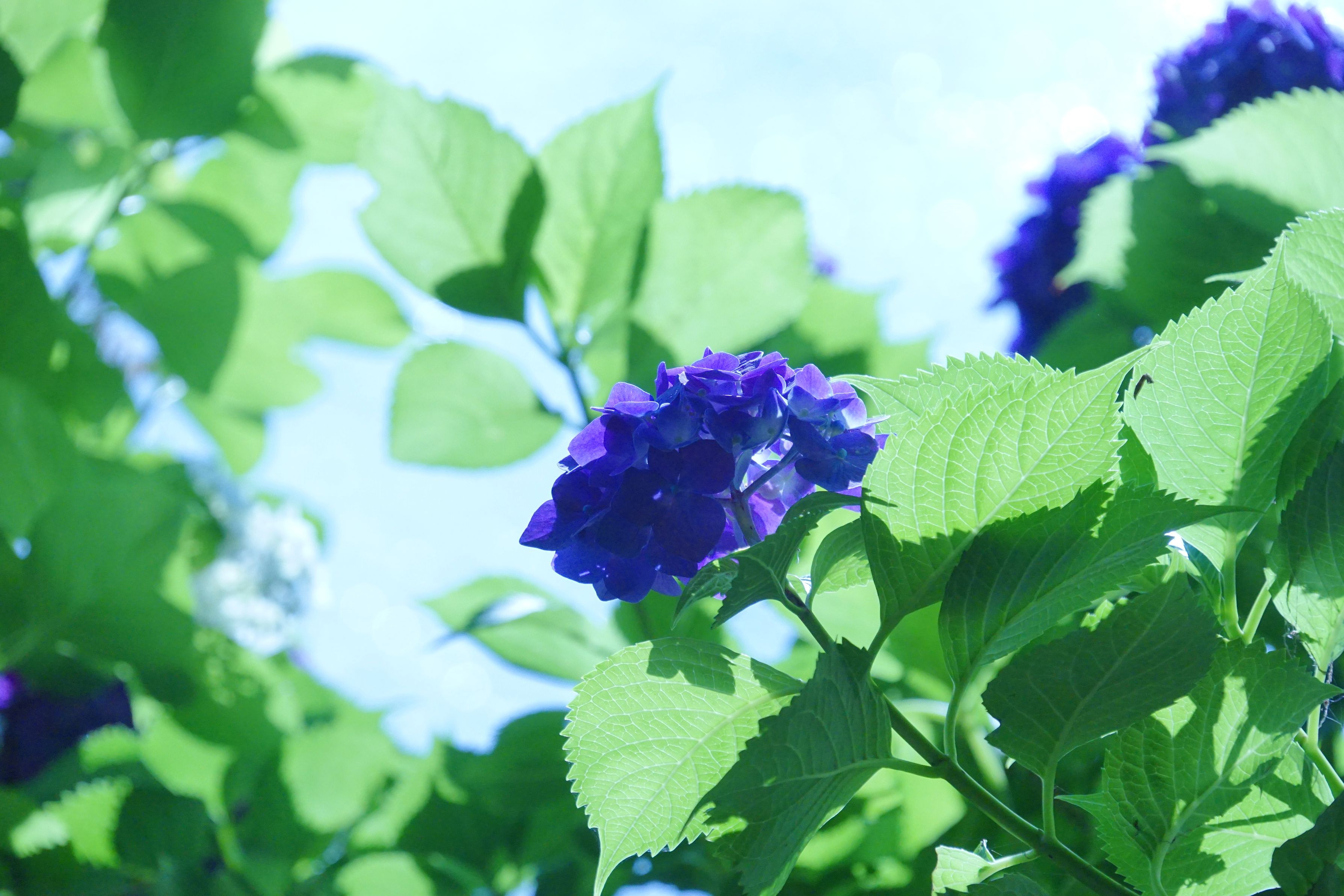 逆光に輝く青い紫陽花が綺麗でした。