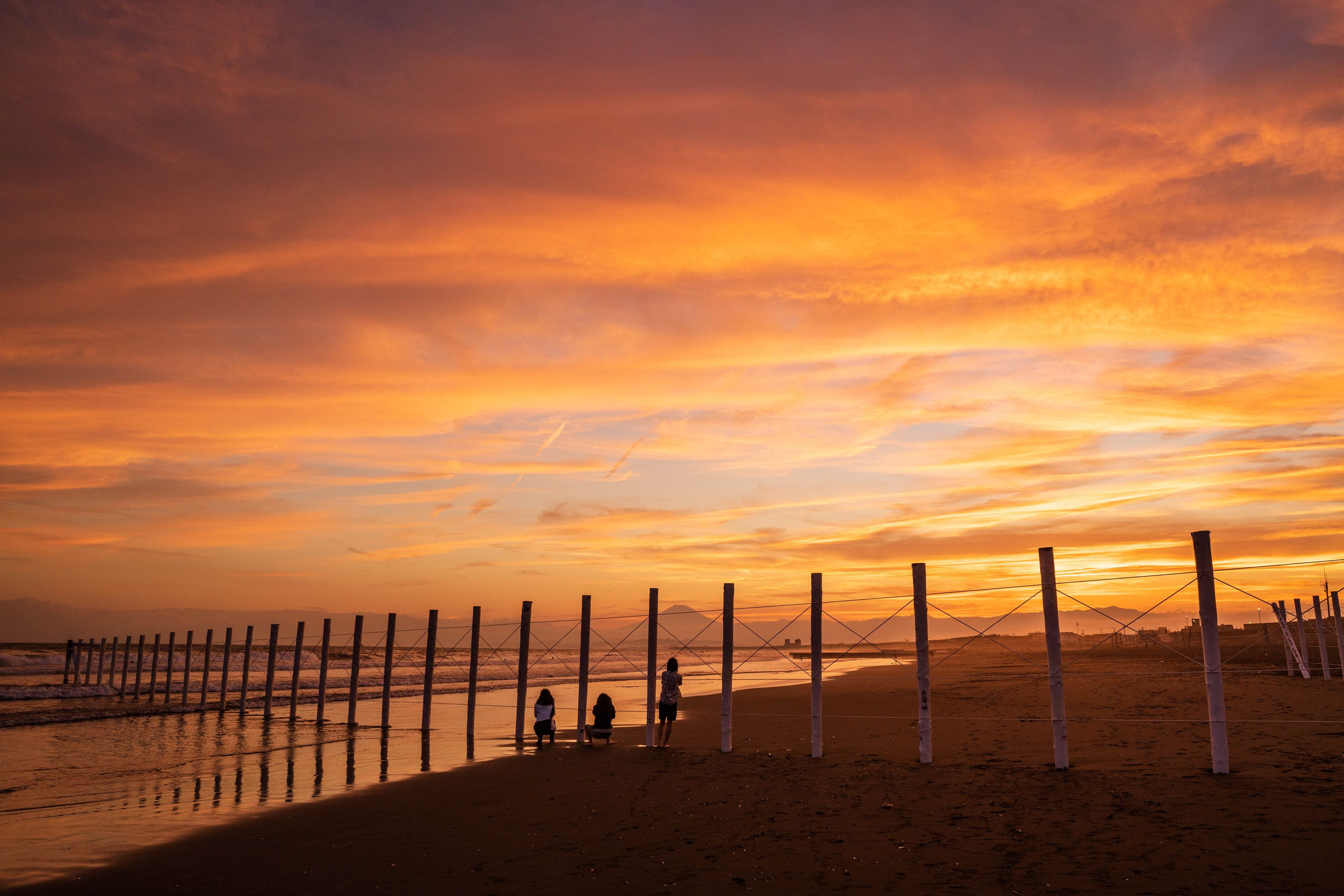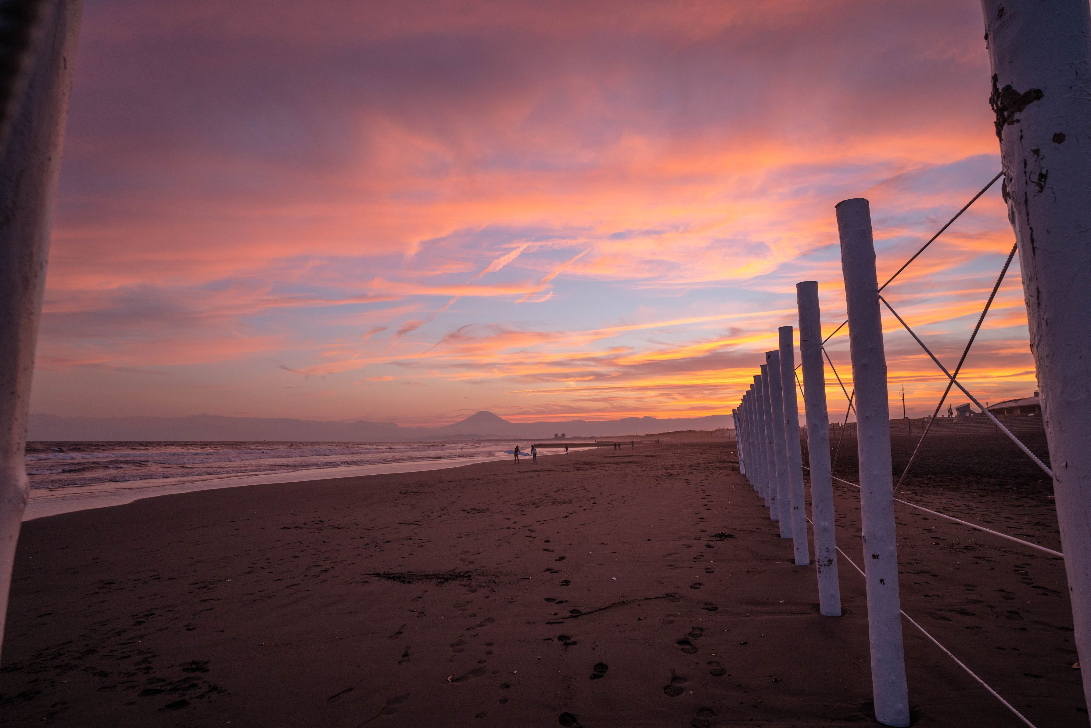 鵠沼海岸に白杭設置されてました。 初白杭撮影、爆焼けの日となりラッキーでした♡ 富士山もバッチリ♡ 白杭撮影ご常連の方達は 長靴はいたり、素足、海の中に入って撮影されていました。 靴を履いていたのは私だけ、、、
