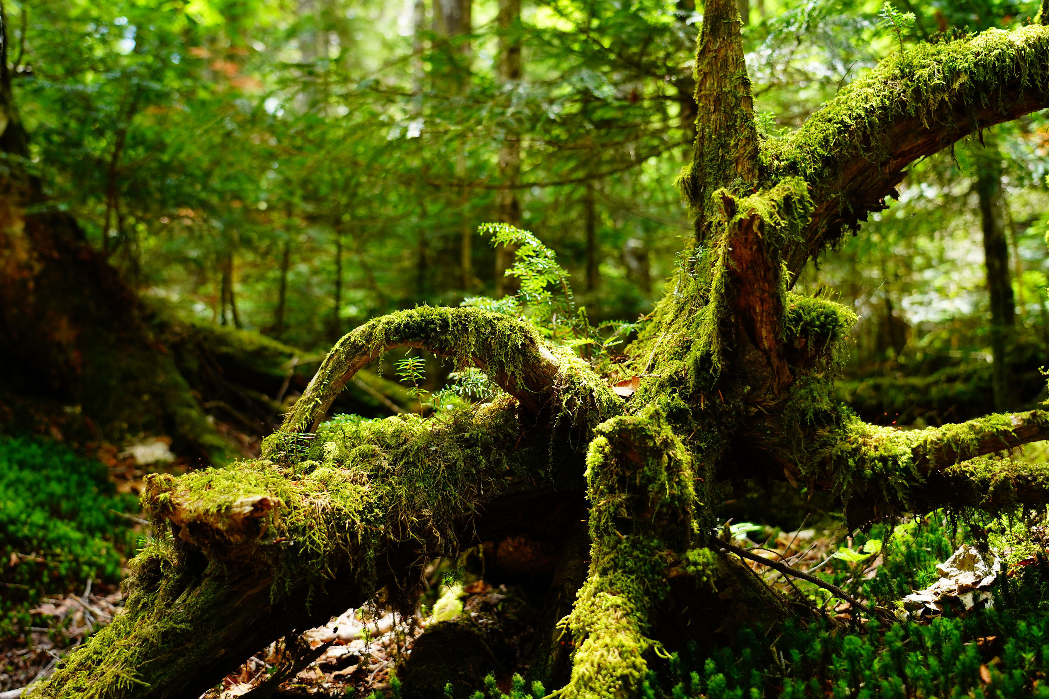 木漏れ日のさす白駒の森の倒木とコケ等を切り取る。