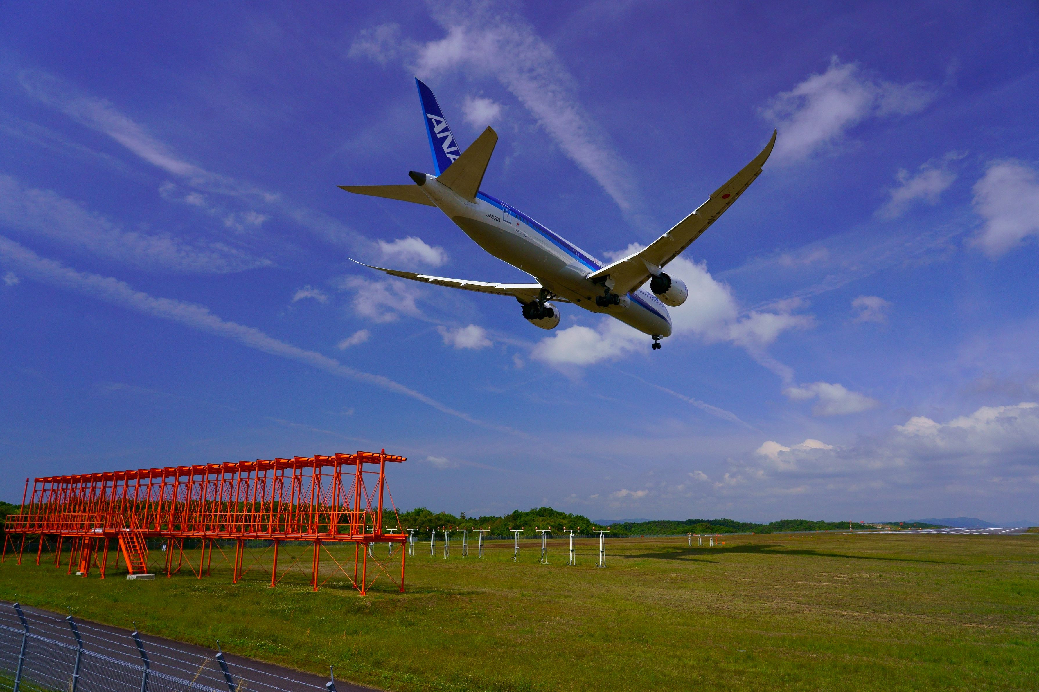 広島空港にFinal approachで侵入してくるANA B787-9です。 広島空港には、滑走路横にウエイポイントがあり、上空にたくさんの飛行機が通過するため、この様に飛行機雲が出来て、それがいい背景となっています。 α7iii + SEL24105G SS: 1/1,000, F8, WB: Auto, ISO: 200
