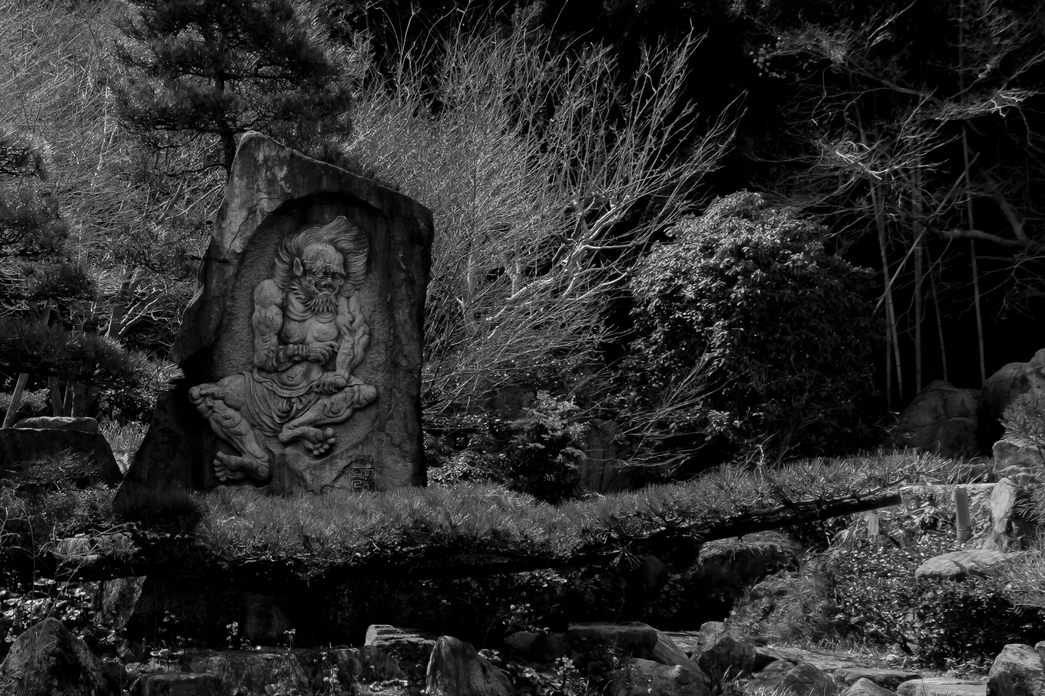 石山寺山門のすぐ手前に、いかつい迫力のある石像がありました。 画角が足りなかったので、トリミングしました。また、モノクロ化したものと合わせて掲載してました。