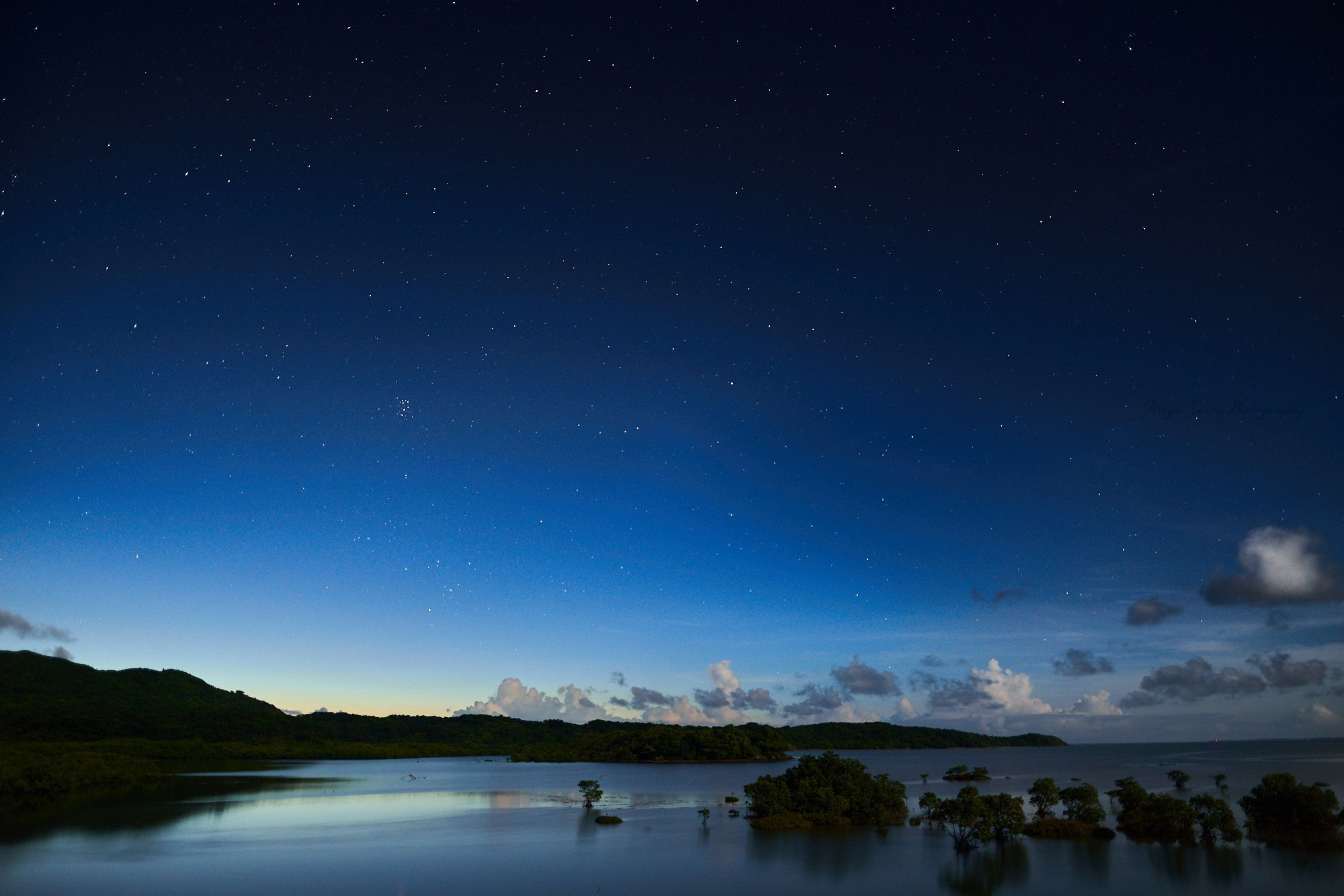 柏倉陽介さん写真教室にて 夜の明けきらない午前4時の暁。 向こうに朝の光が差し込んできているのに まだこんなに星が写りました。 朝日の前にこんな素晴らしい景色がありました
