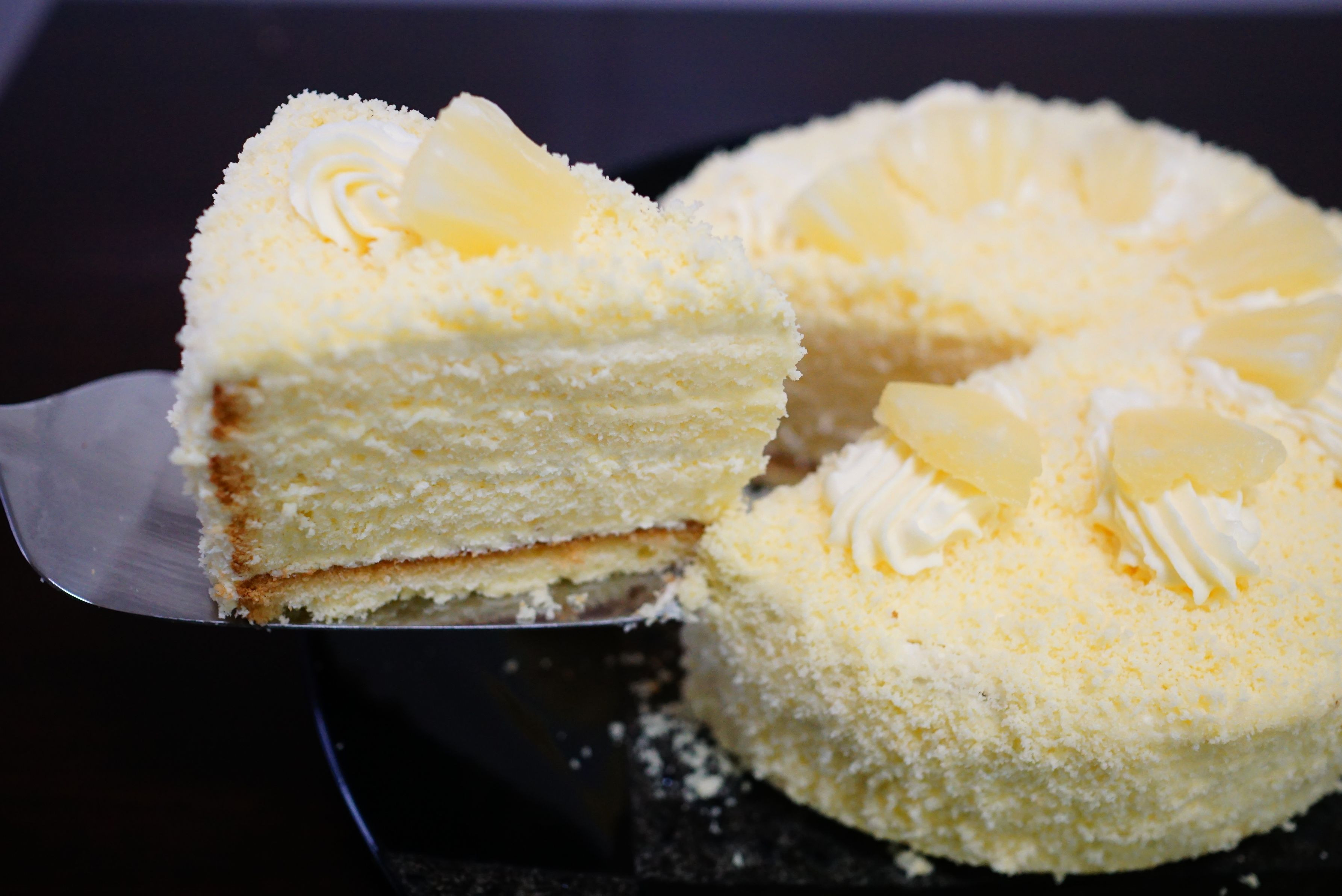 先月のレッスンで作ったアナナスザーネトルテ。パイナップルのケーキです。 スポンジ生地にパイナップルジュースで作ったクリームをサンドしています。 ちょっとトロピカルな感じが致します~(*´ω`*)