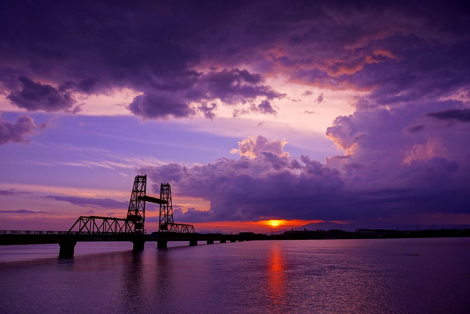 昇開橋の真ん中から、夕陽が顔をだす風景