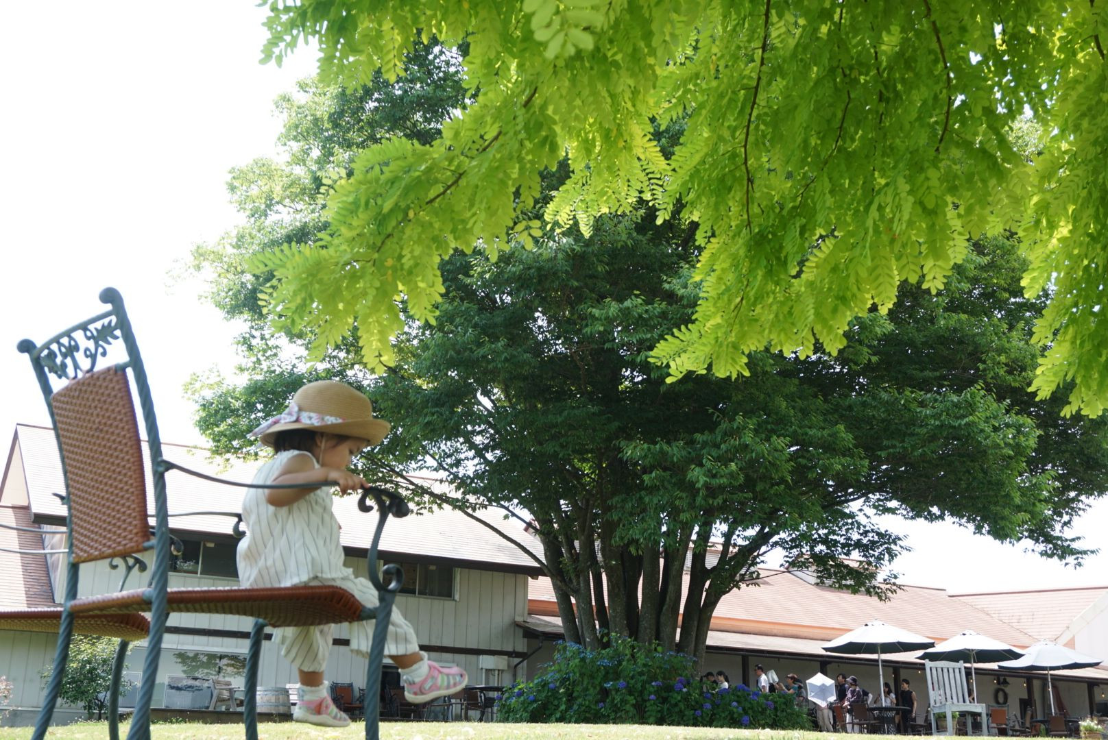 大きな木の下の椅子で、風を楽しむ娘でした。。 どこのマダムだよ。。