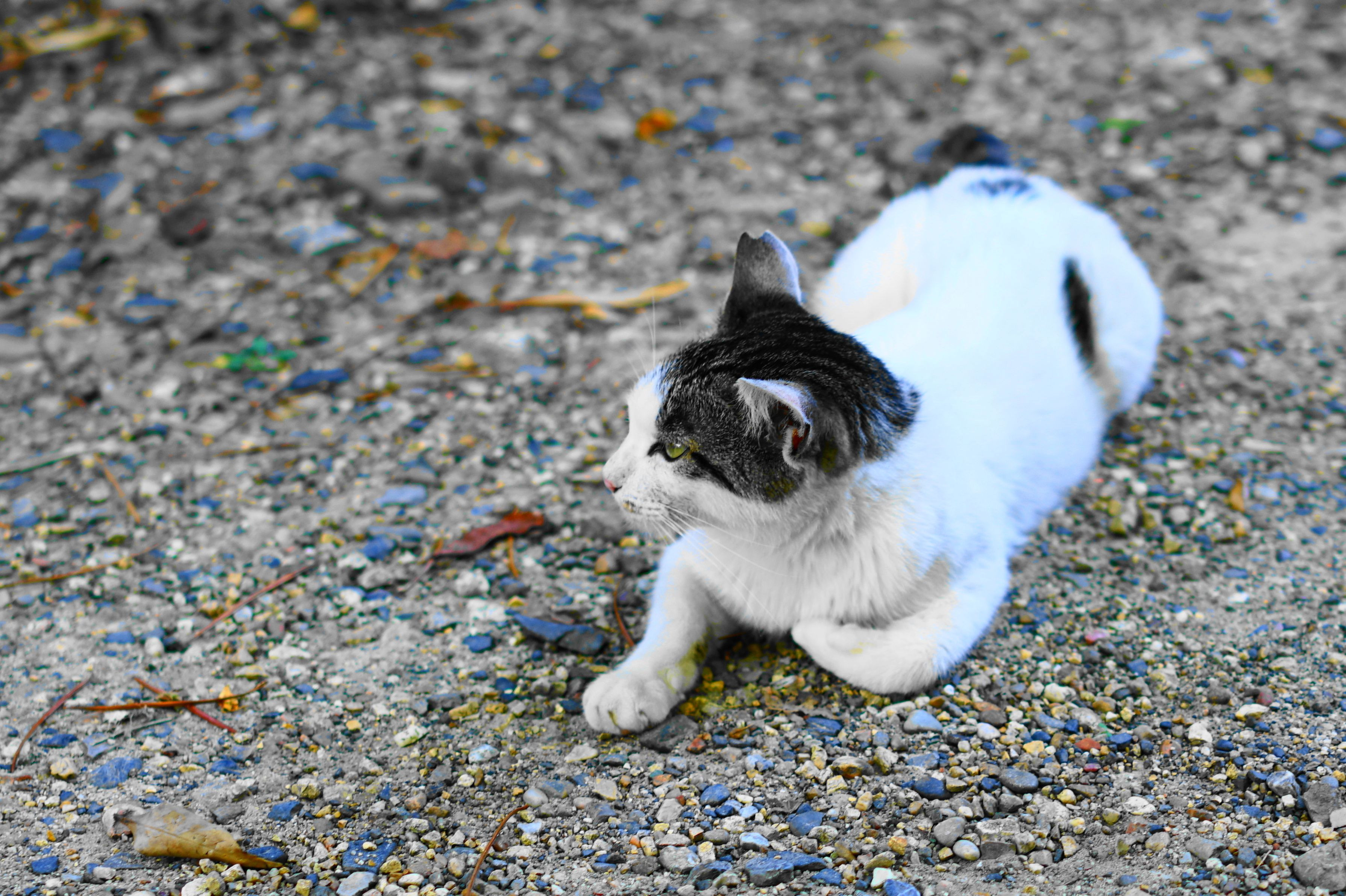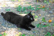 連日の猛暑の中、猫たちは日陰で休息していました。 1枚目に写っているのは前にも紹介した黒ちゃんです。 2枚目には、以前に投稿した「緊張する猫」や「こんにちは!また会いましたね!」に登場した猫が写っています。黒と白の2色なので、二毛ちゃんと名付けました。