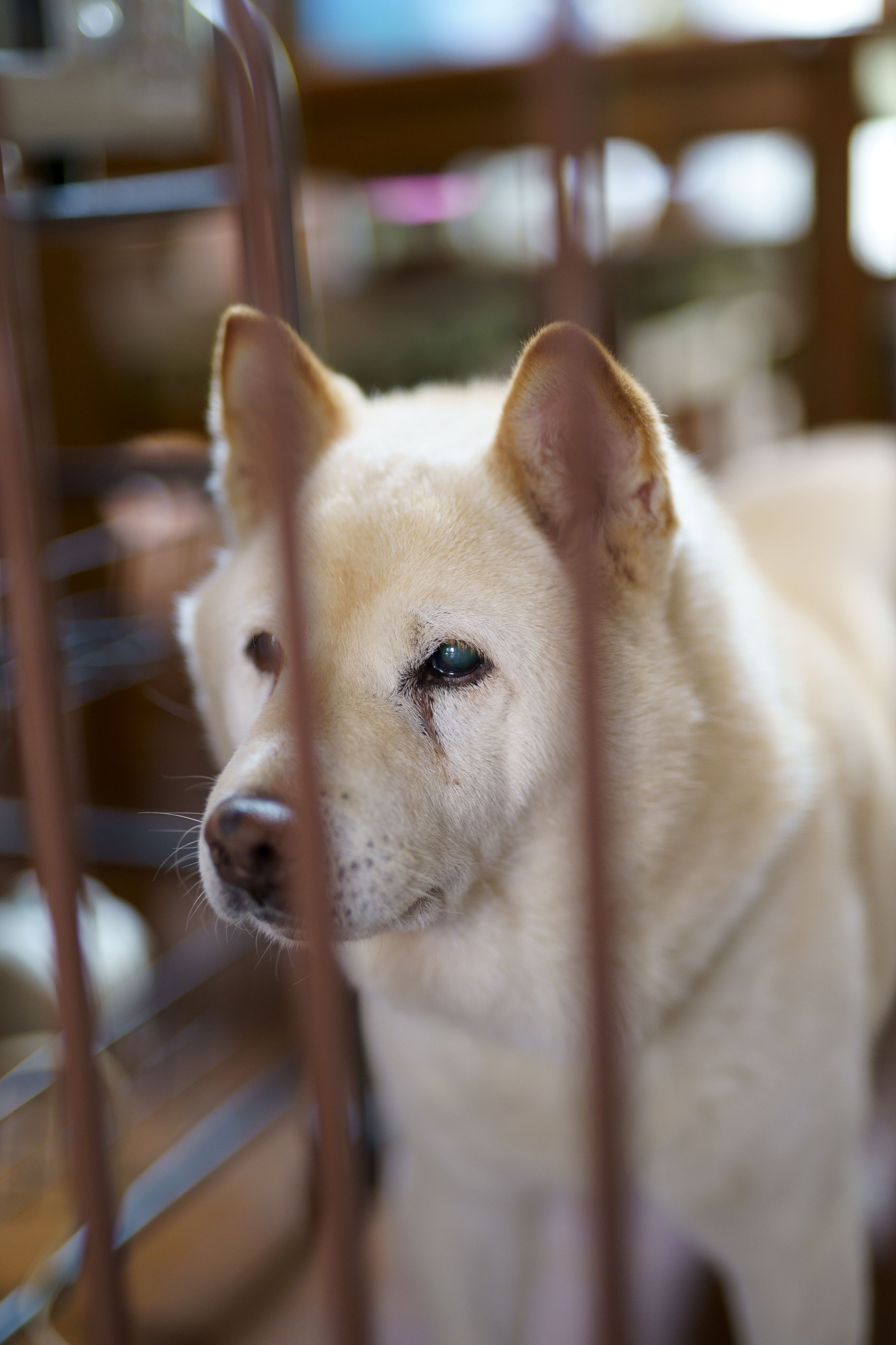 妻の実家にて。 柵越しにキッチンの様子をうかがう16歳の老犬。