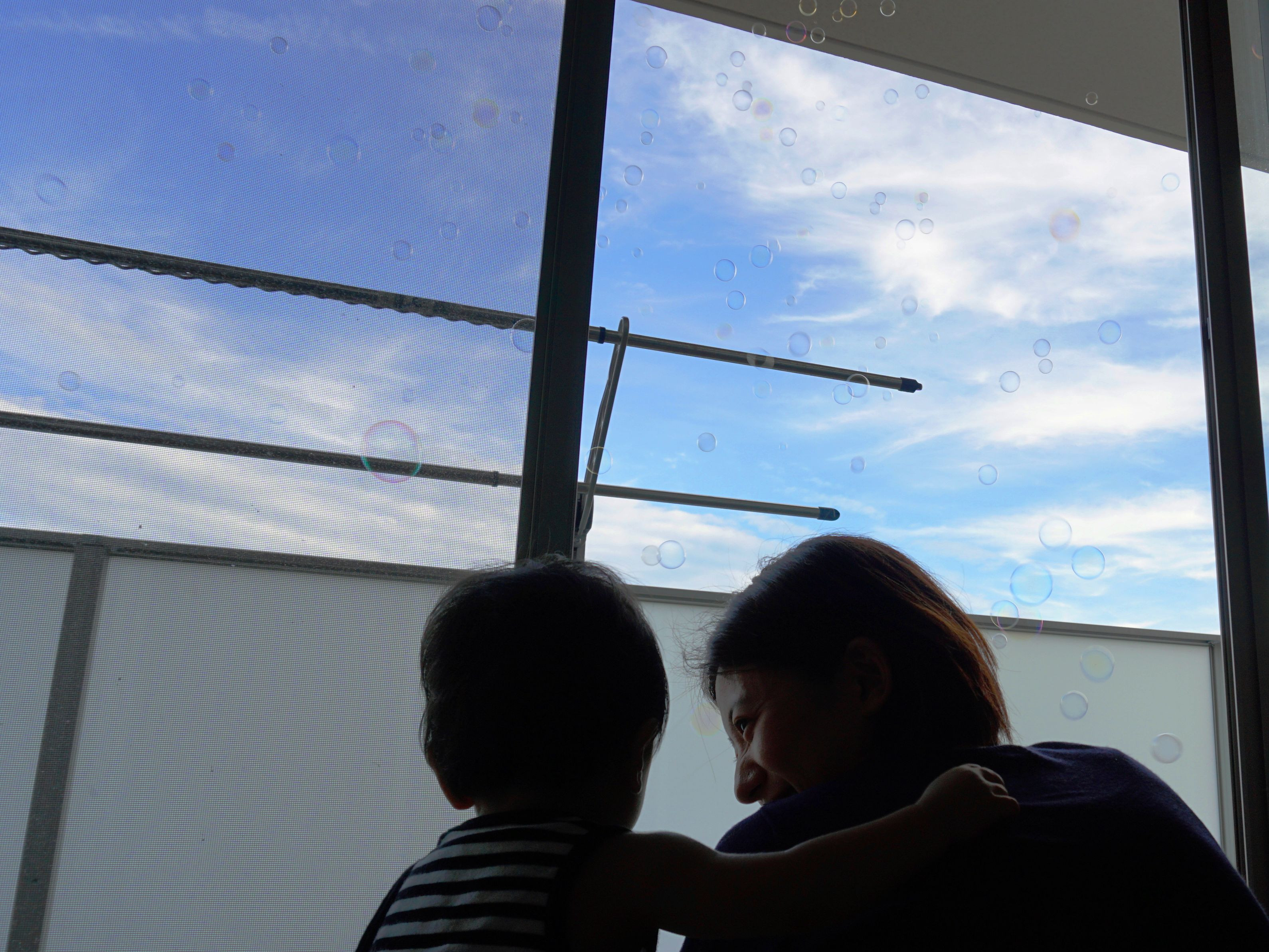 息子を喜ばせるために、数十年ぶりにシャボン玉を購入!! ベランダから夏空へシャボン玉が飛んでいきました