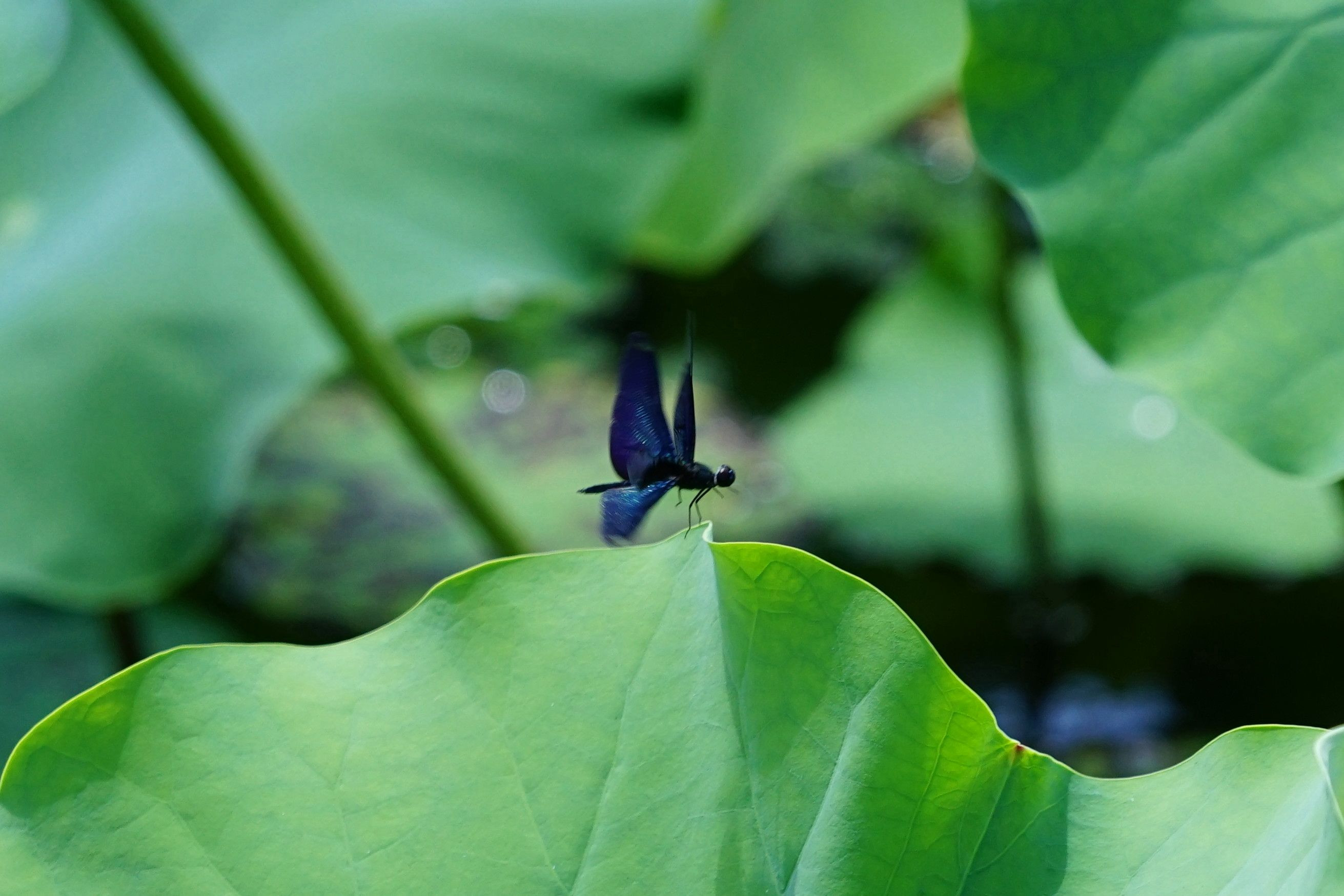 蓮の葉に止まっているのではなく、飛んでいます。動きが速くて画面にとらえるのが至難。