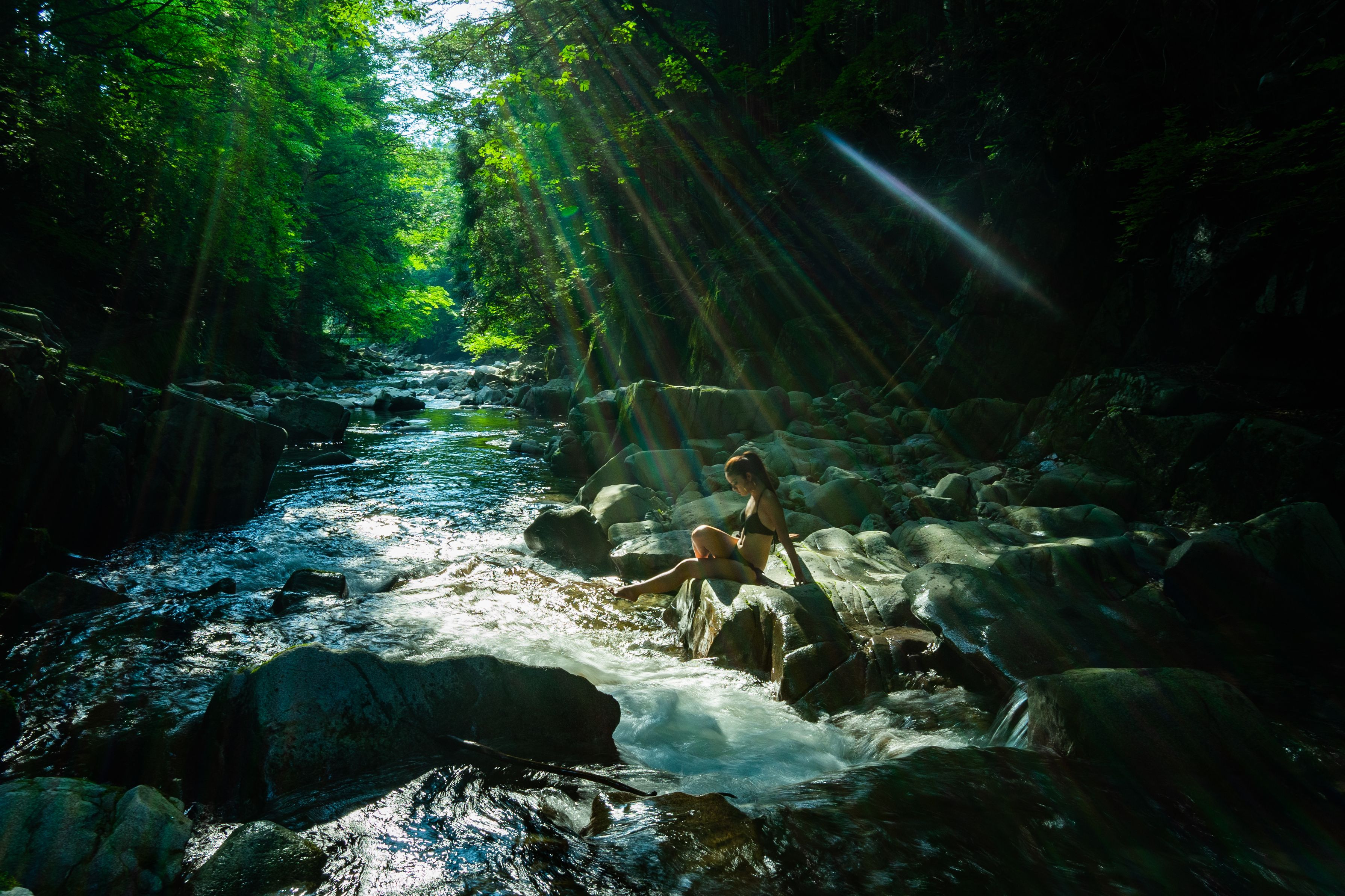 天川村にて 絞り切って撮影したバージョンです。 αのライブビューだからこその狙って撮れる光芒 涼し気な清流がさらに涼し気に表現できました。