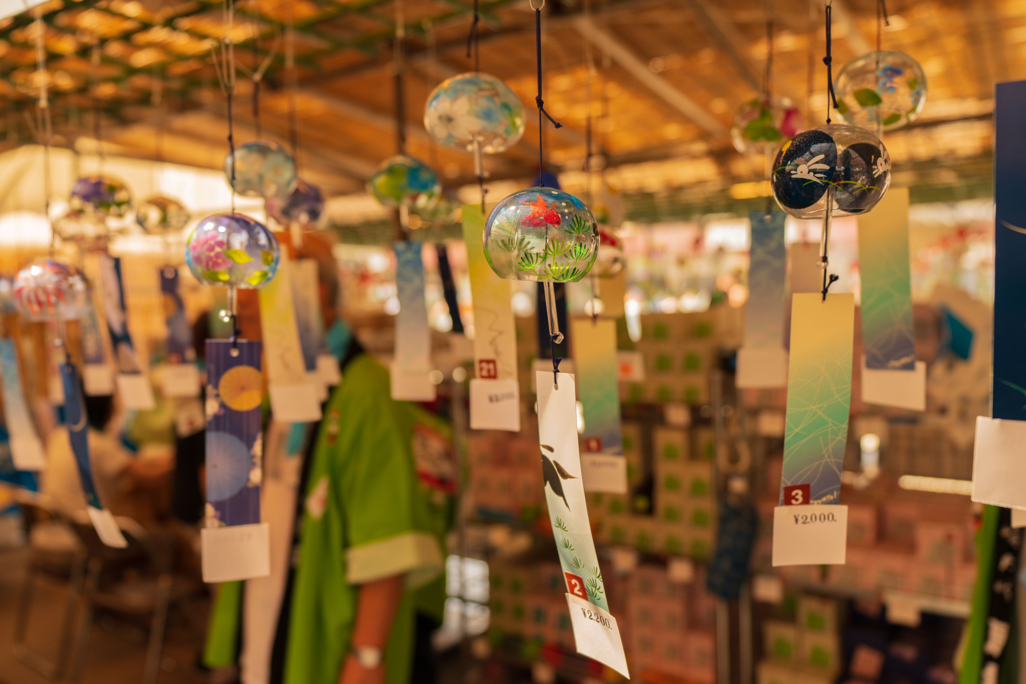 川崎大師風鈴市での一コマです。金魚が描かれた風鈴が可愛いです。