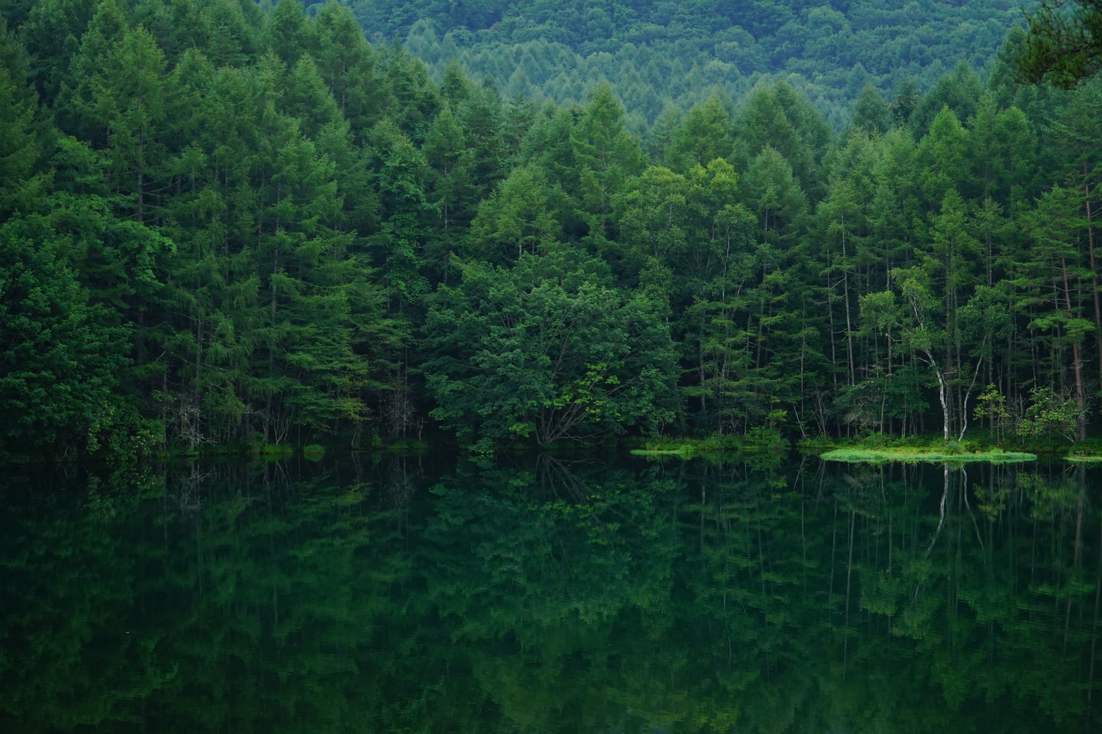 長野県にある御釈迦池。私が行った時には既にかなり整備されており、駐車場もありました。朝は風がなく、湖面に木々が写りこみます。東山魁夷の絵に魅せられて、同じ景色を見に足を運びました。