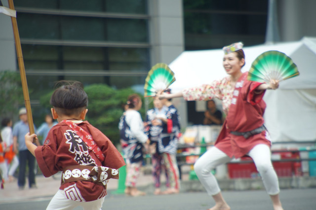 小さな子供がお祭りに参加しているとつい撮ってしまいます。 子供がお祭りの音と雰囲気に驚きながらも最後には踊りの真似をしながら楽しんでいる様子がよかったです。