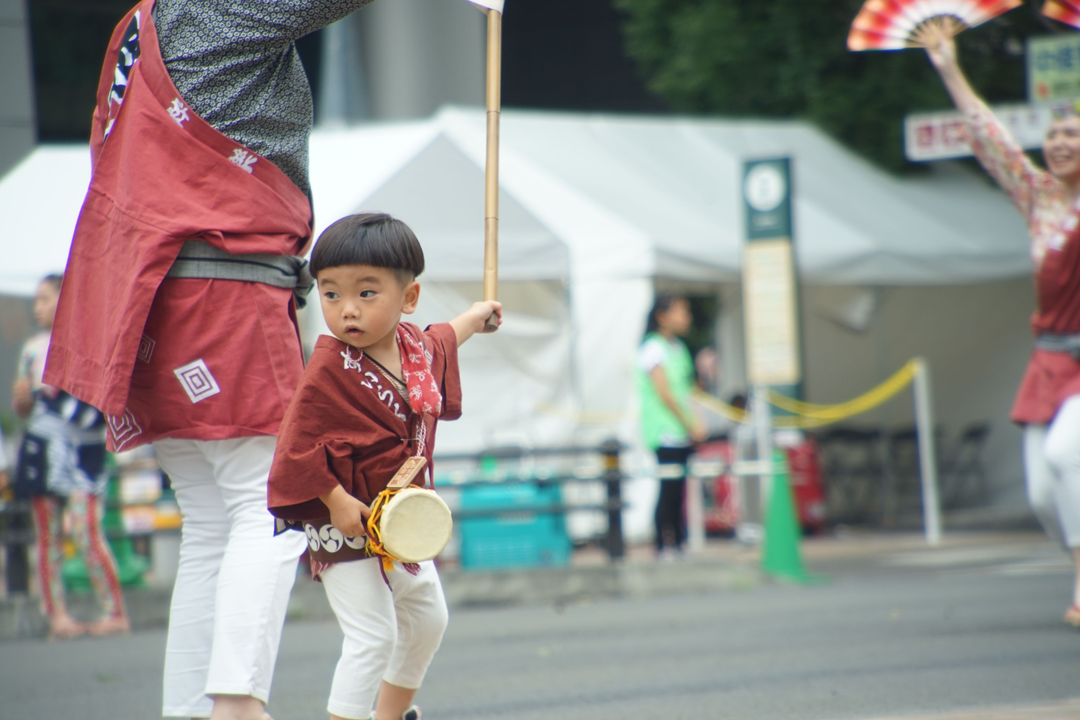 小さな子供がお祭りに参加しているとつい撮ってしまいます。 子供がお祭りの音と雰囲気に驚きながらも最後には踊りの真似をしながら楽しんでいる様子がよかったです。
