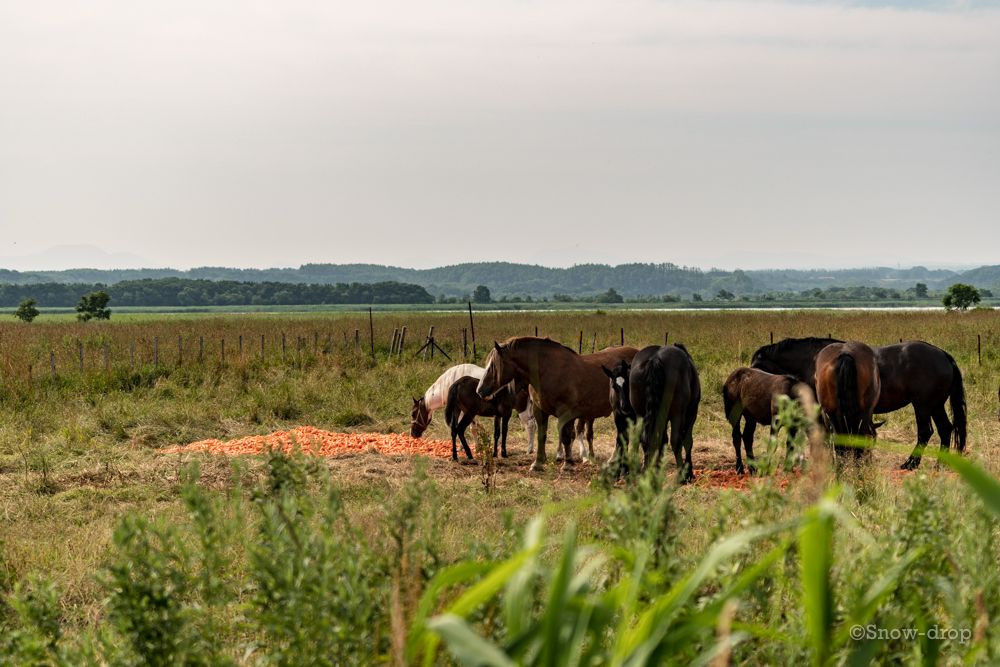もぐもぐもぐ。もぐもぐもぐ。 ひたすら食べ続ける馬たち。 贅沢にも人参が大量に巻かれていました。 はじめて観た光景。