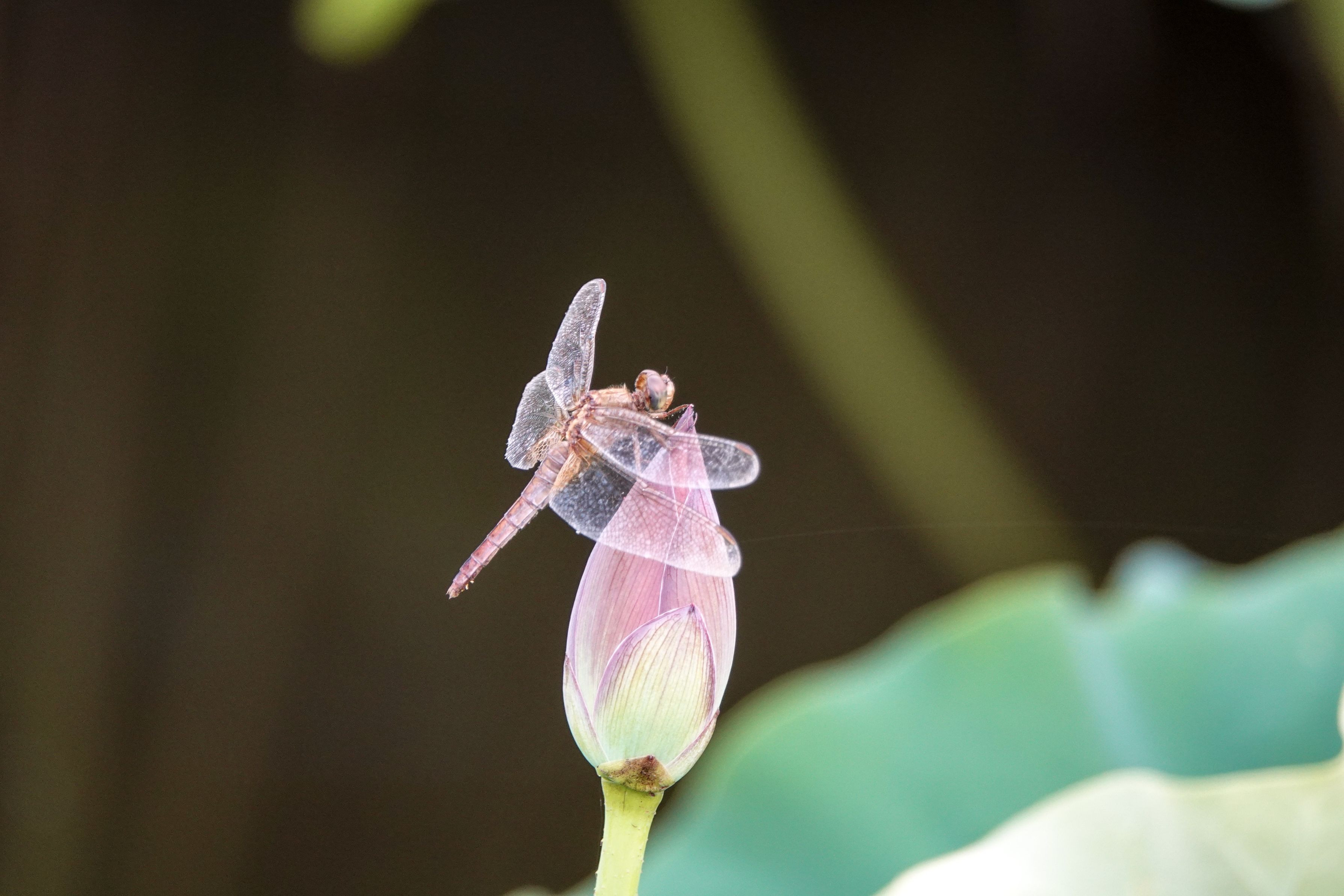 ハスの花の蕾に、夕陽を浴びて、 トンボの翅が透き通っていました(o^^o)