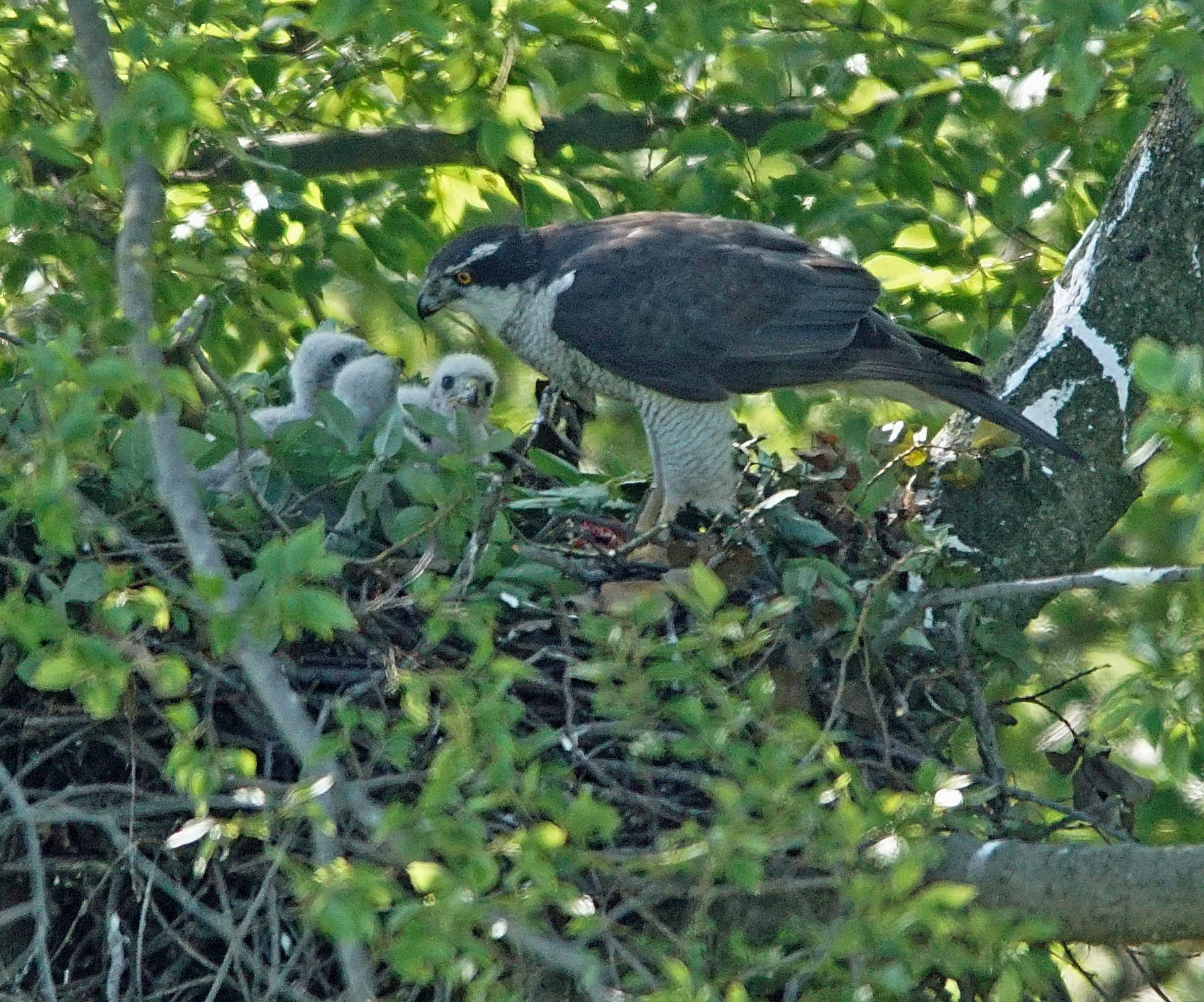 #オオタカ#《蔵出し》 孵化して間もない白い産毛のオオタカの雛4羽が親鳥が 嘴でちぎった肉を競うように食べていた。