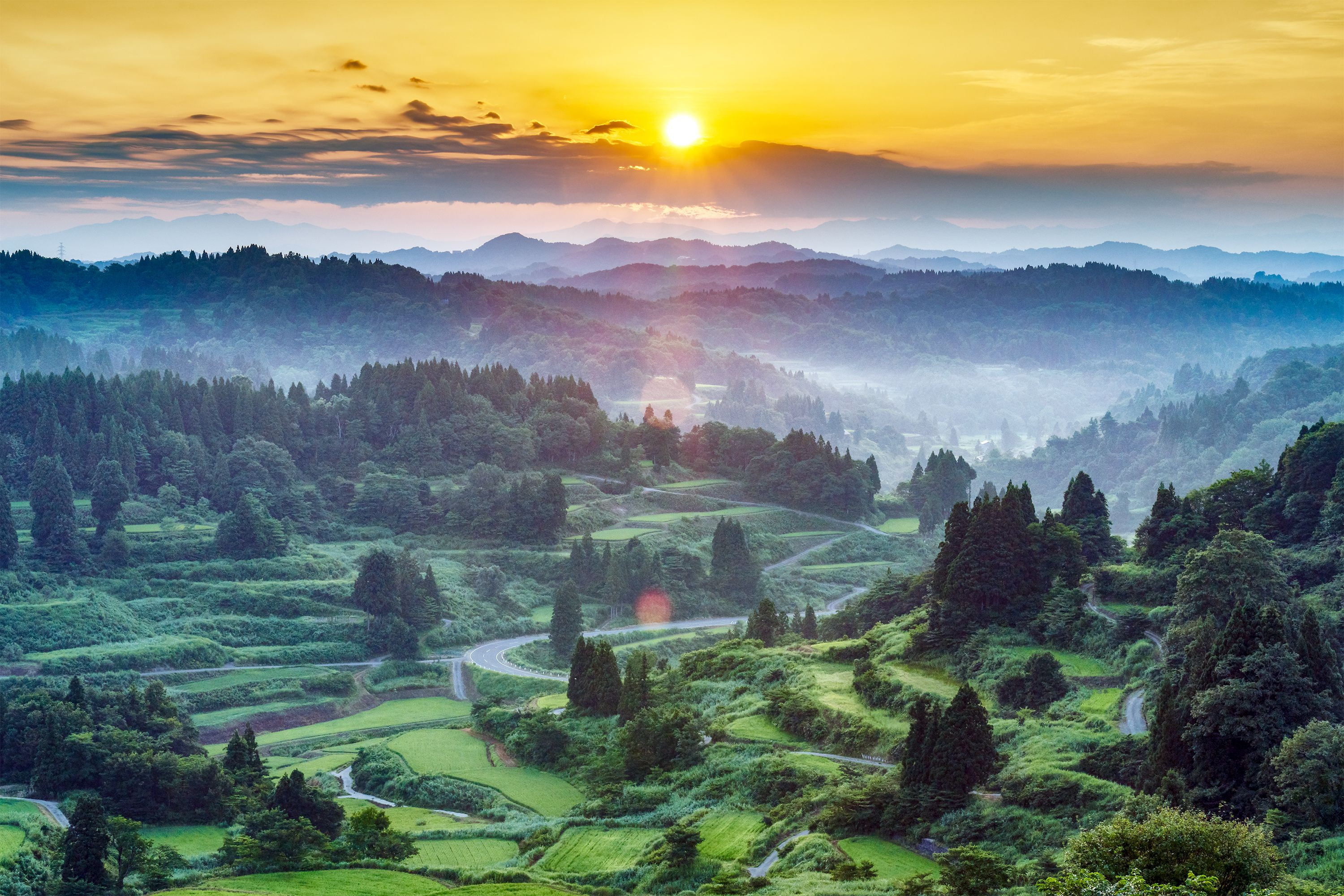 夏の星峠です。日の出から少し経ったところ。太陽を真ん中に入れるため棚田の南東に移動しました。
