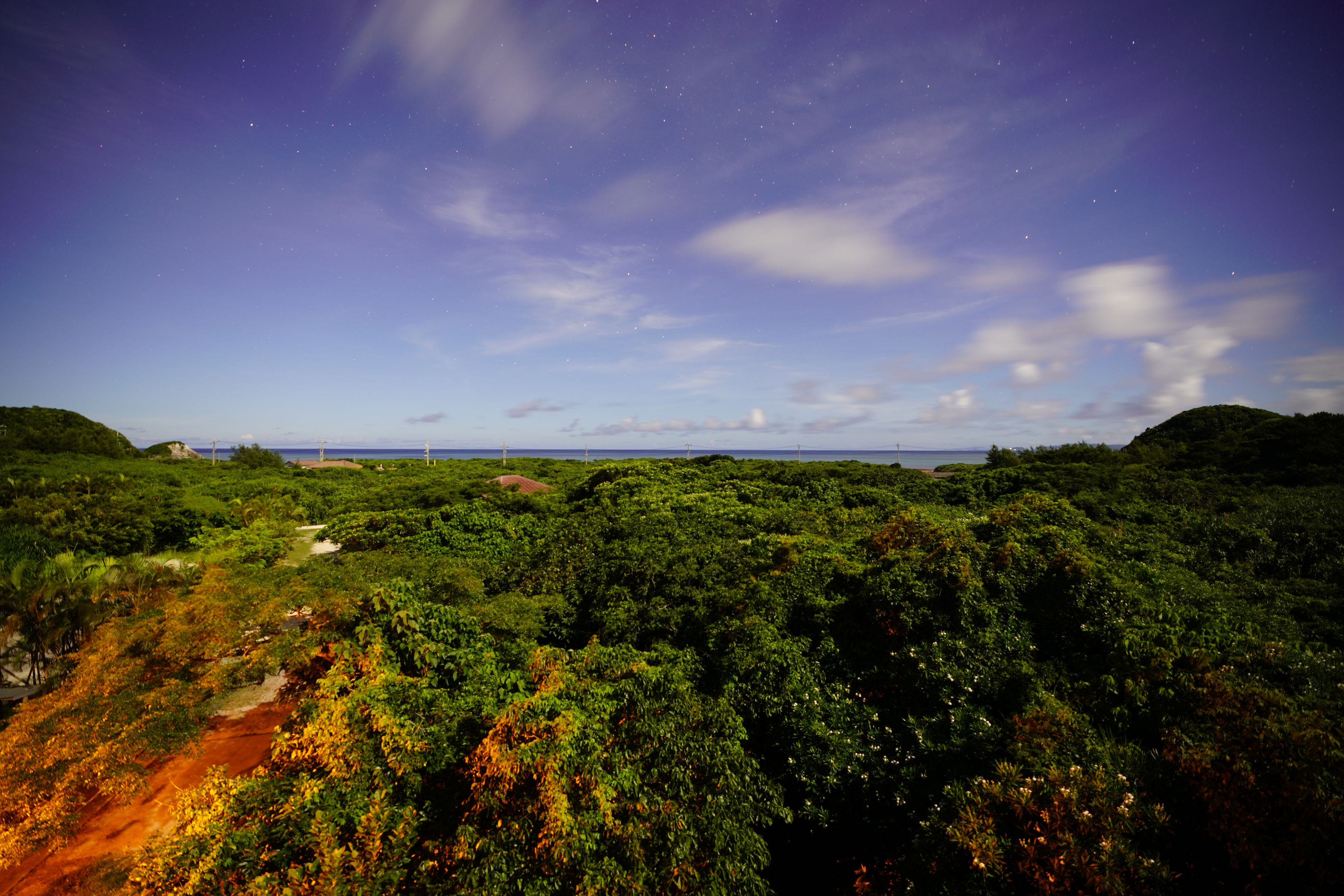 満月の明かりの中、泊っているホテルの 屋上で長秒露光で撮ってみました。 昼間のような明るさなのに空には星が写る 幻想的な風景になりました。