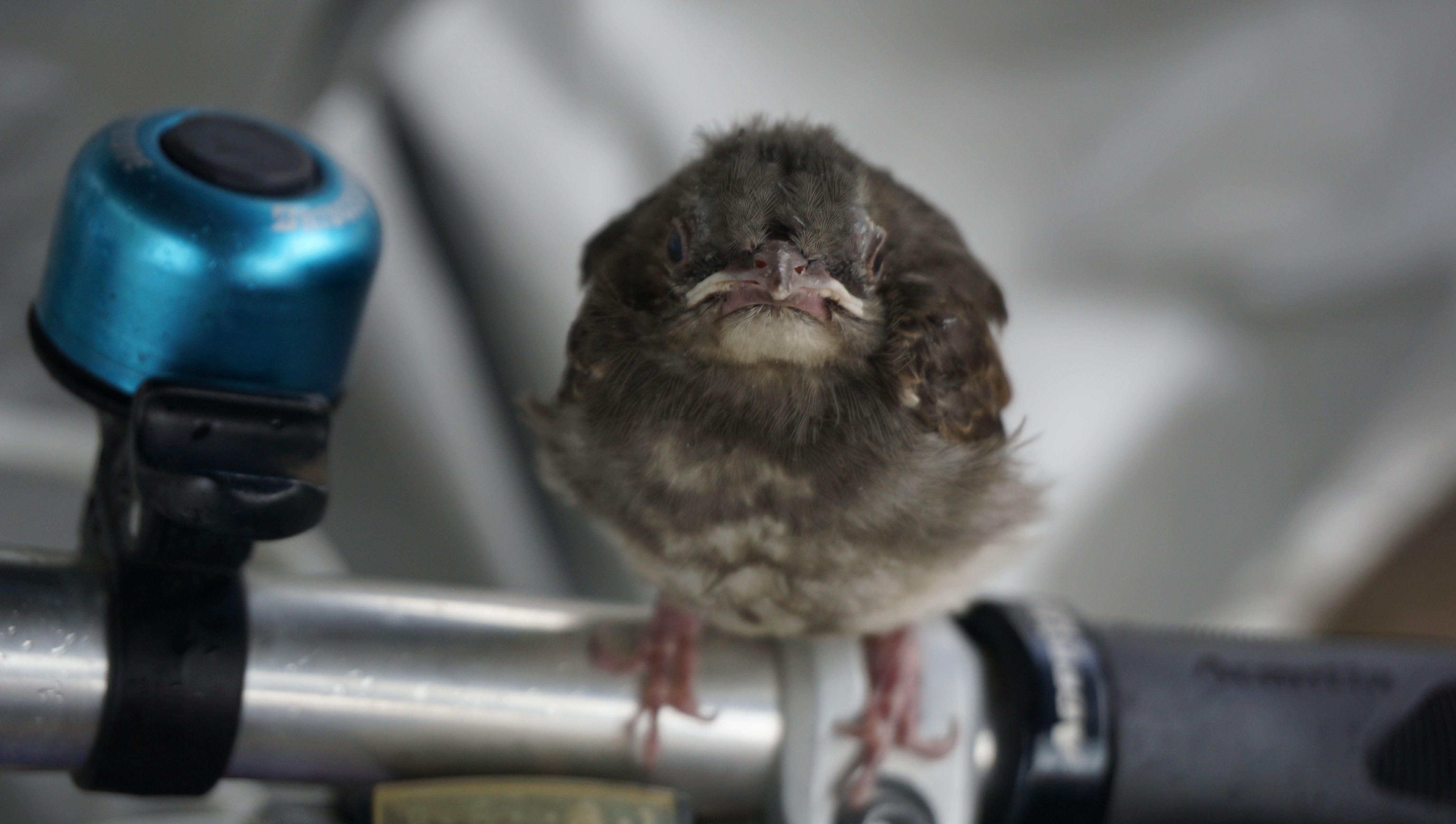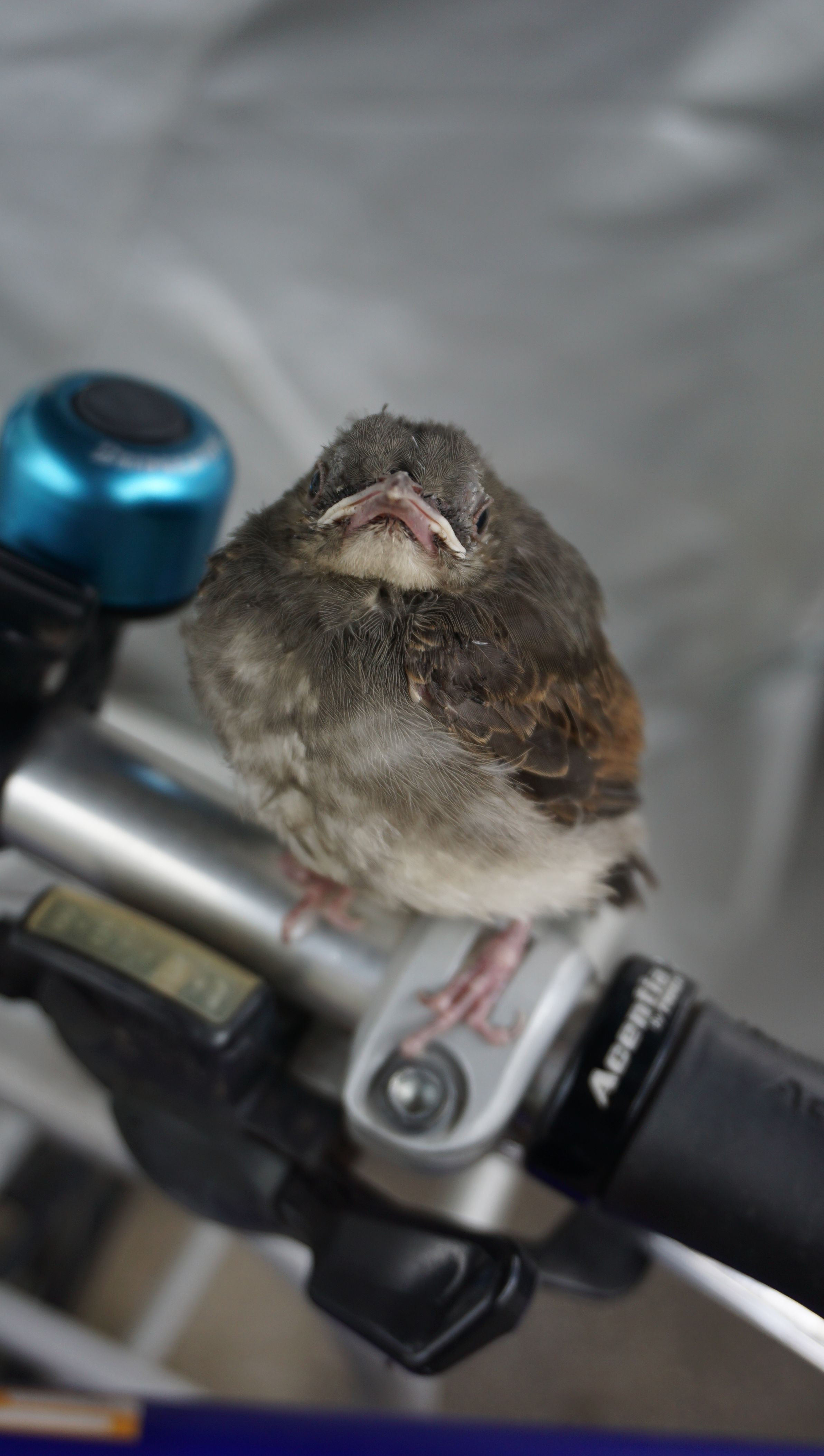 台風通過後に自転車に乗ろうとしたところかごに小鳥が。 そのまま乗るわけにもいかず、徒歩で出かけ戻るとハンドルに。 数時間後には飛び立っていました。