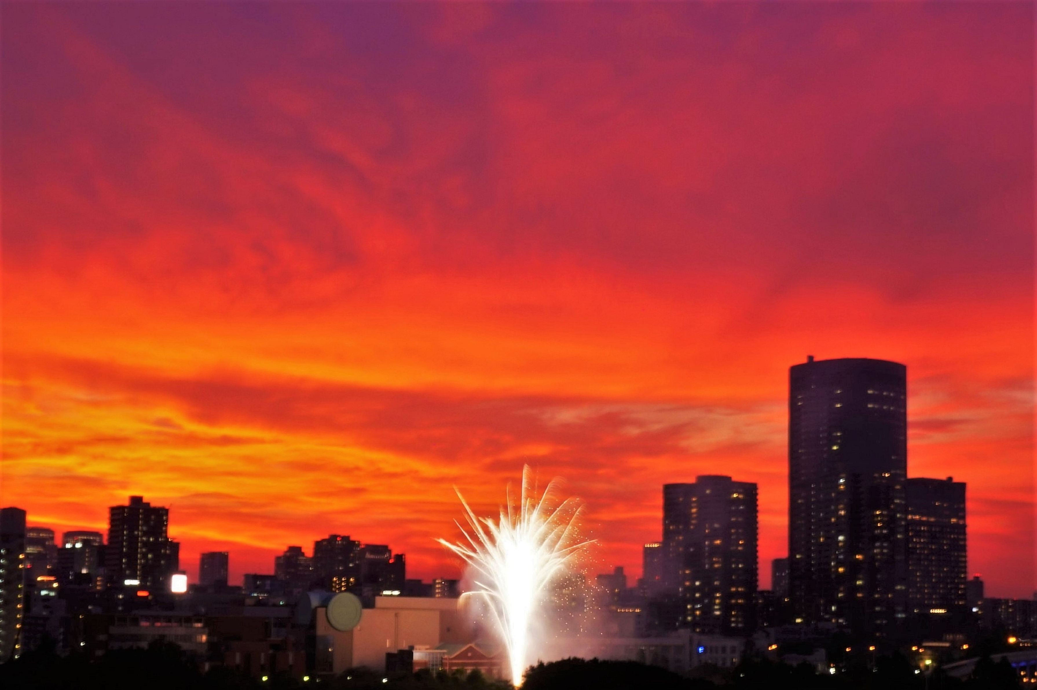 空が真紅に染まり、、、と思ったところで花火が!! 天神祭り花火大会の始まりです。