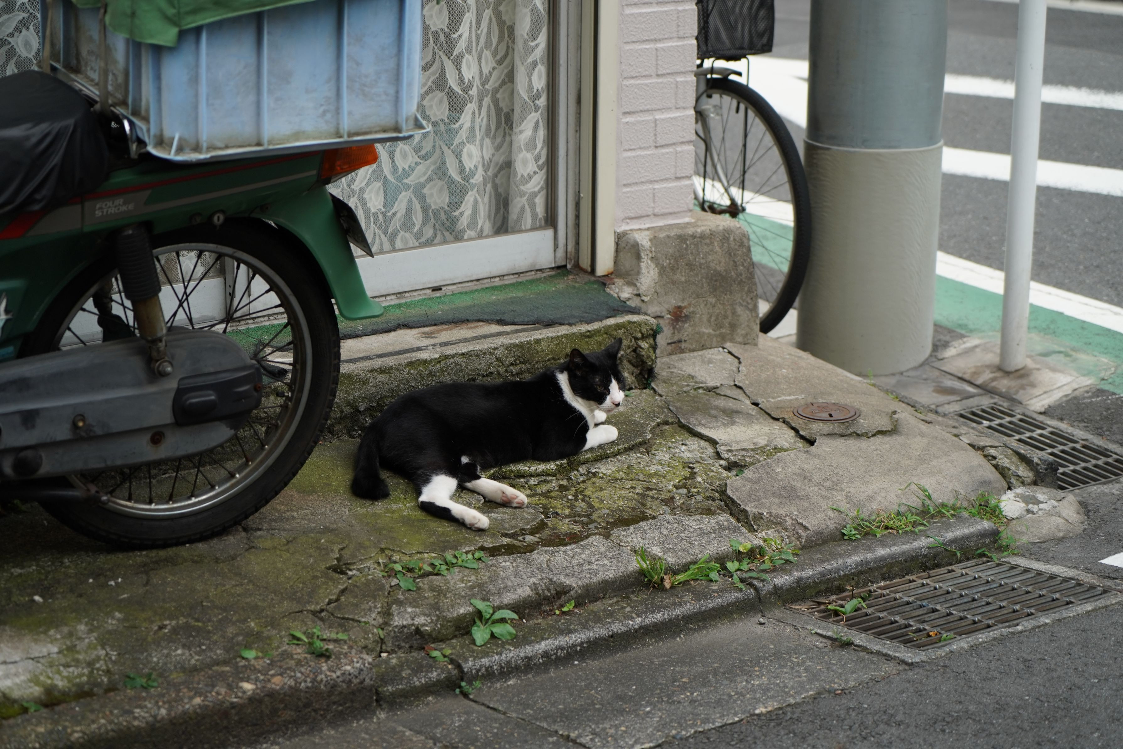谷中で、野良猫がくつろいでいました。 猛暑の日、この猫は、目と口をあけて死んでいるかのように寝ていたので、本当に死んでしまっていないかを心配していたのですが、無事な姿を拝めホッとしました。