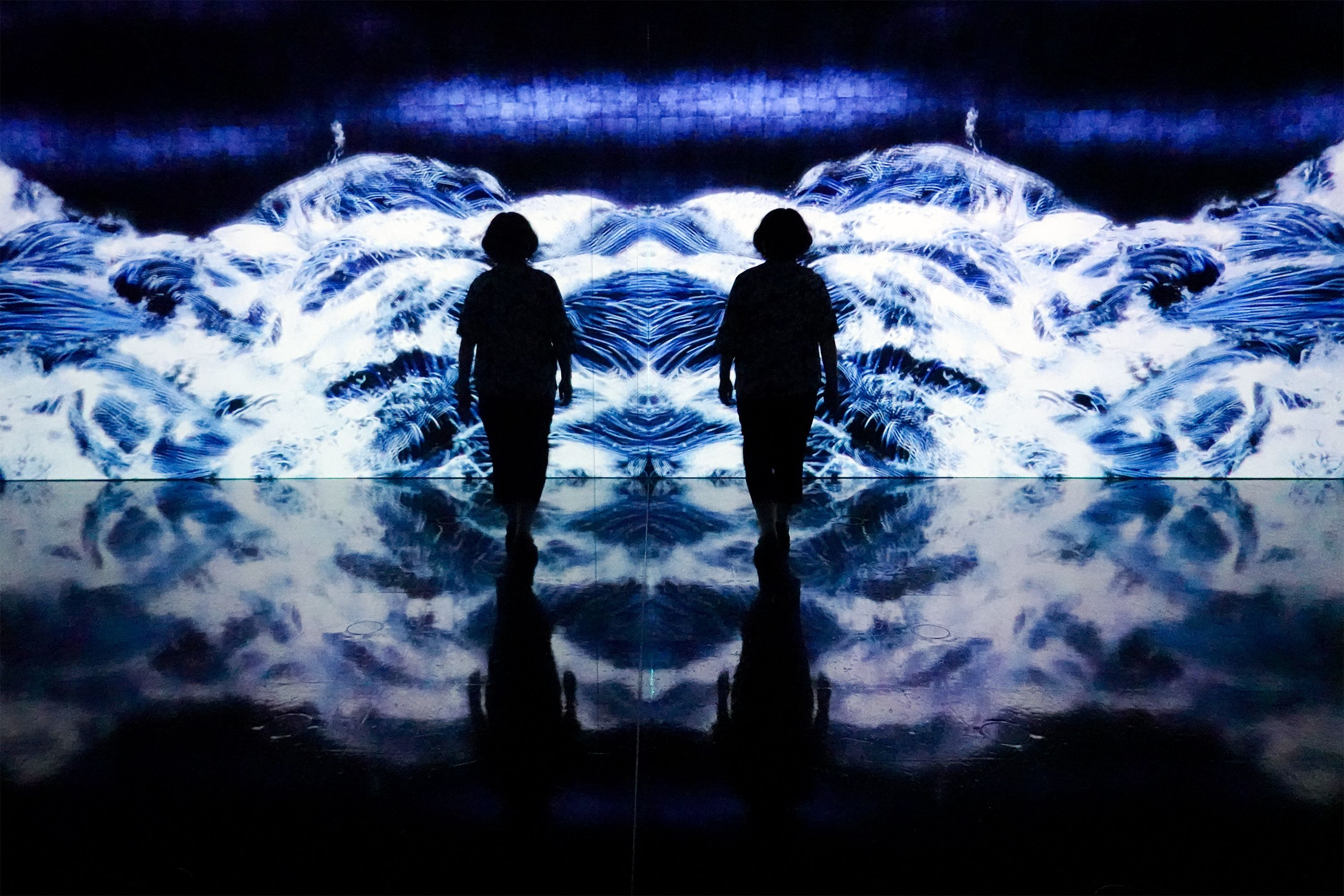「ロールシャッハ」 右が実像、左が映り込みです。 ロールシャッハテストってありましたね! いろいろなもの、見えてきませんか? 大阪府大阪市福島区 堂島リバーフォーラム開館10周年特別企画 千住博 & チームラボ コラボレーション展「水」