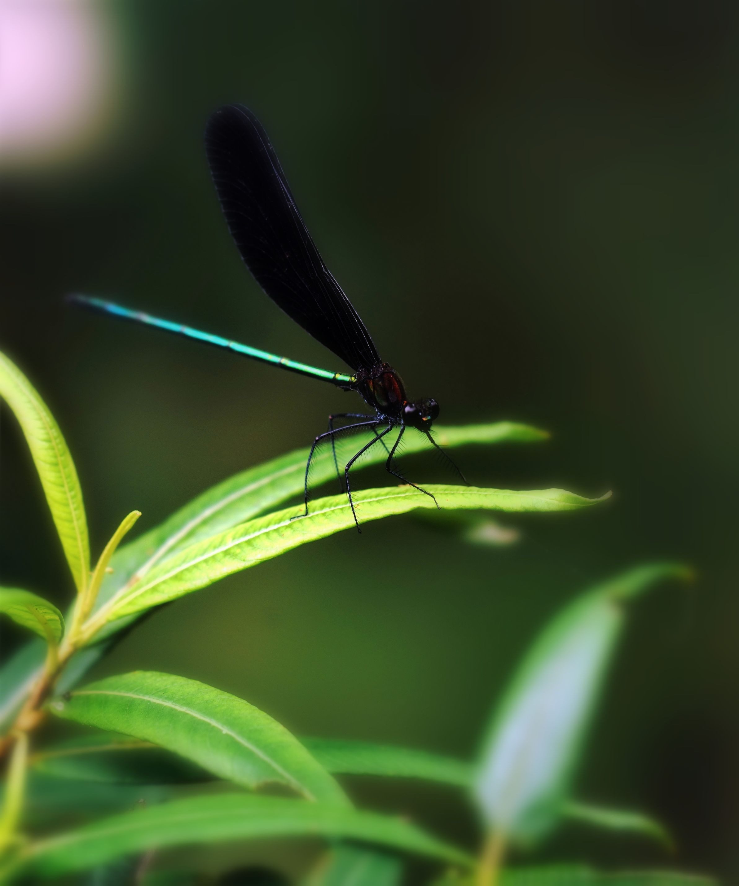 小雨が降っていたので、森を散歩しました。 ハグロトンボに遭遇(^-^; 暗いので上手く撮れませんが、 トリミングしてみました。