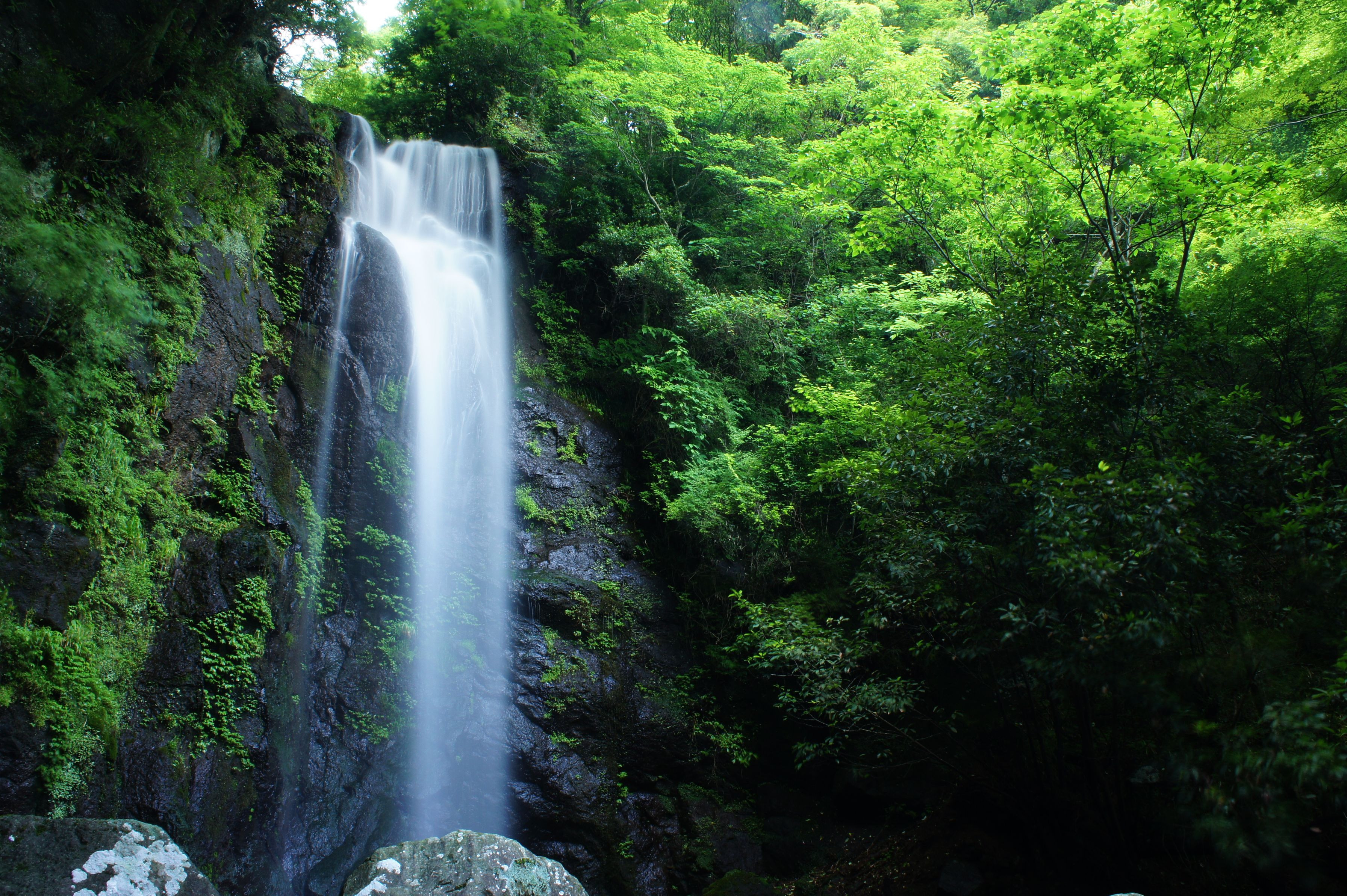 深緑の山の中を豪快に落ちる滝を一枚