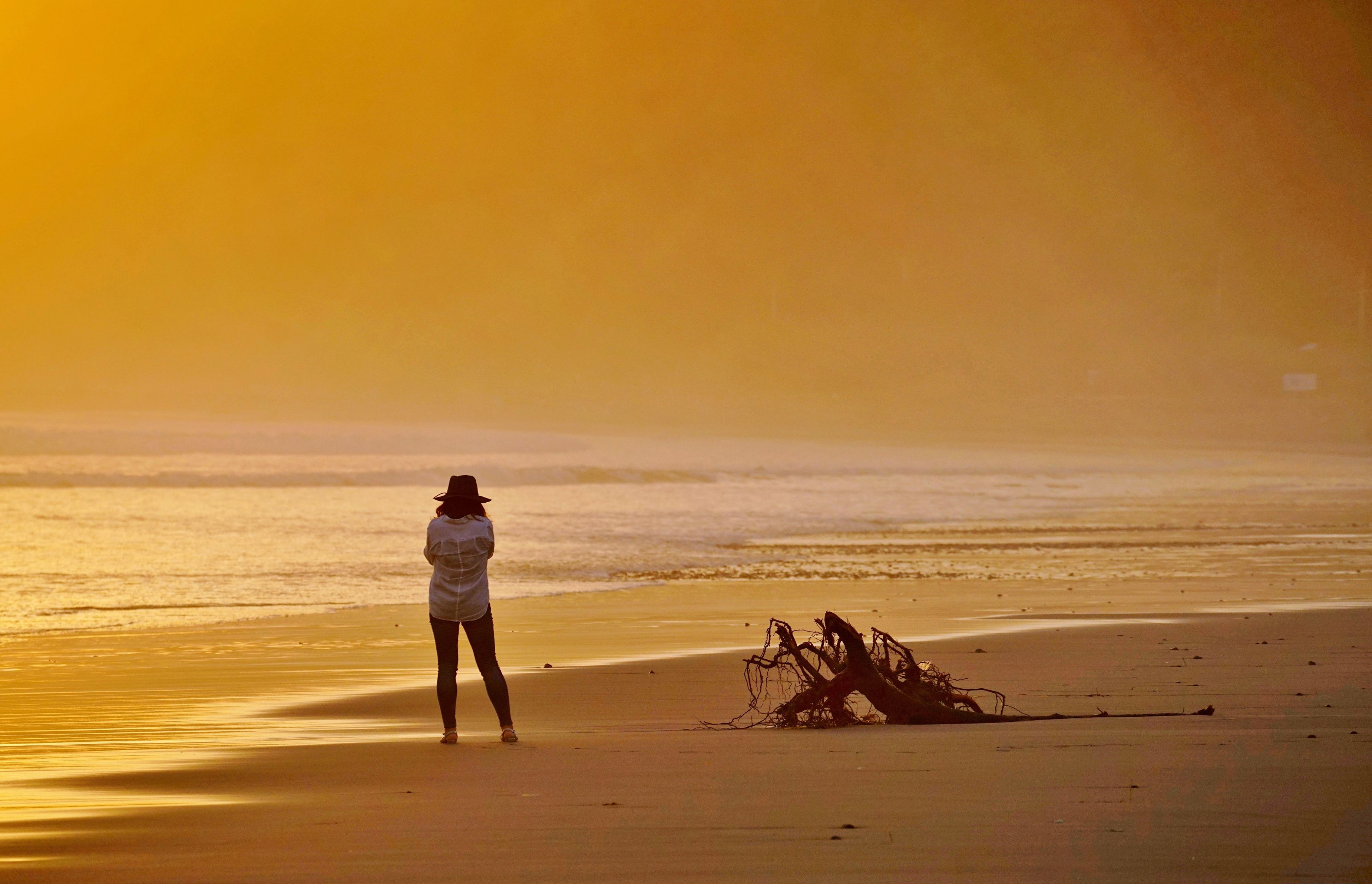 流木は台風20号によるものです。 21号前日の夕焼けを狙うカメラ女子。流木が気になったようです。 波で足元が濡れても撮り続けるカメラ女子。逃げる私は恥ずかしい^^;