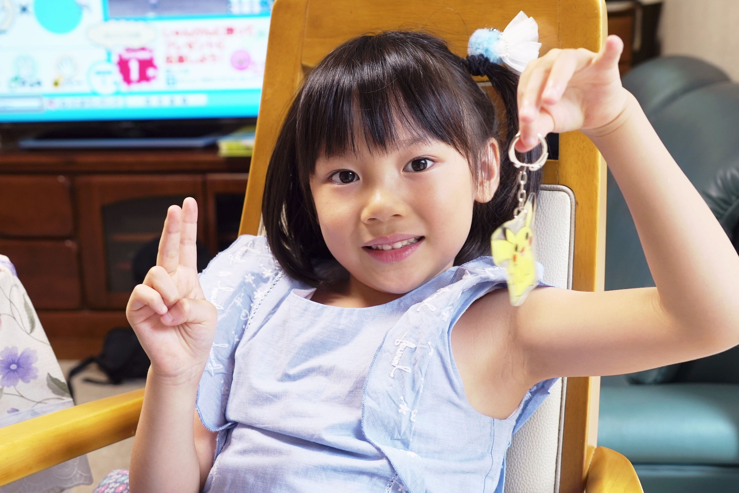 孫が自宅へ来た時のスナップで、ピカチュウのキーホルダーを作って楽しんでいました。