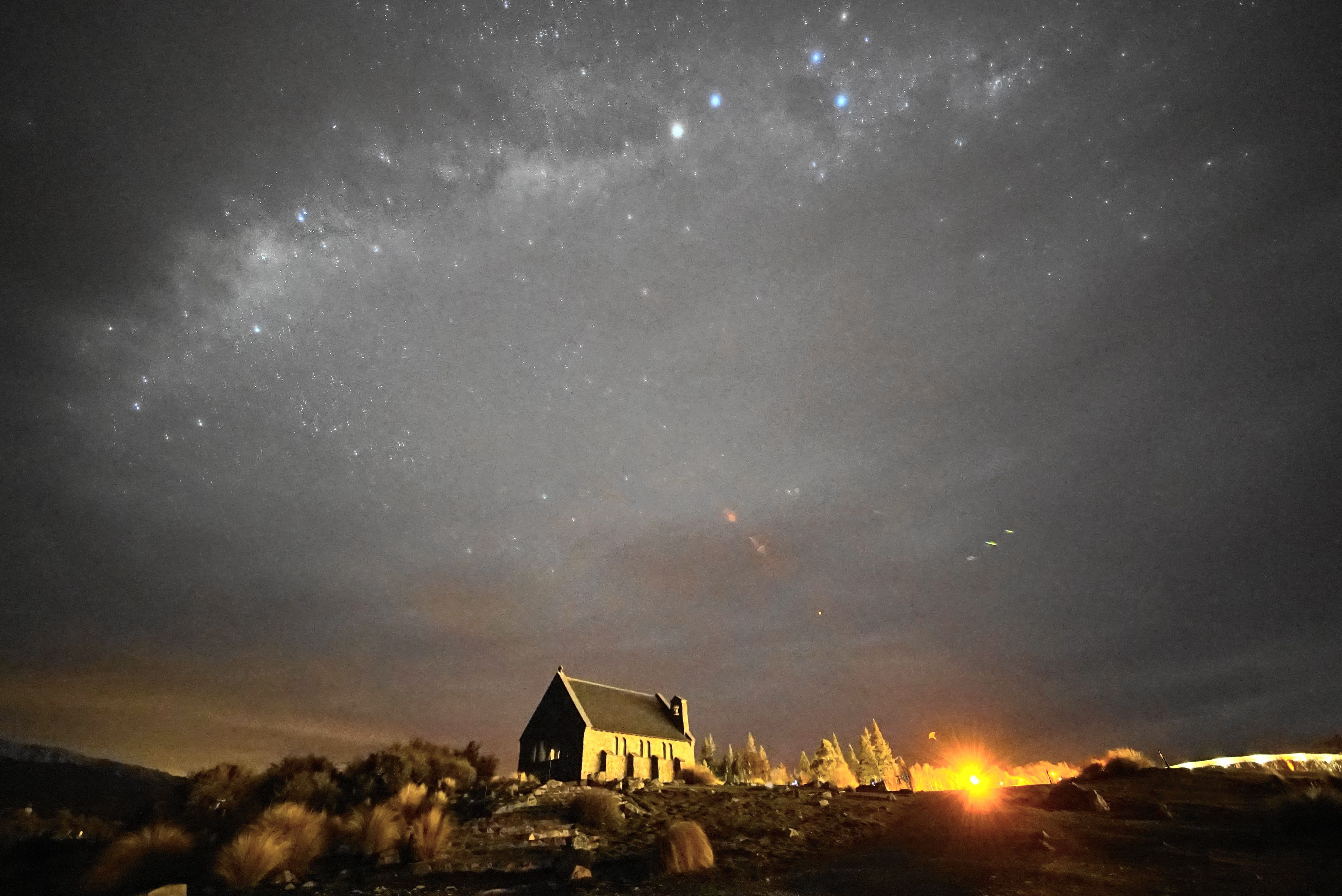 ニュージーランド テカポに着いたとき小雨。星空ツアーも中止。とりあえずカメラを持って撮影ポイントまで行き、雲の流れを見ていると、ちょうど雲が切れ南十字星が見れたので撮影しました。雲がなければもっときれいな天の川が見れたのでは・・・
