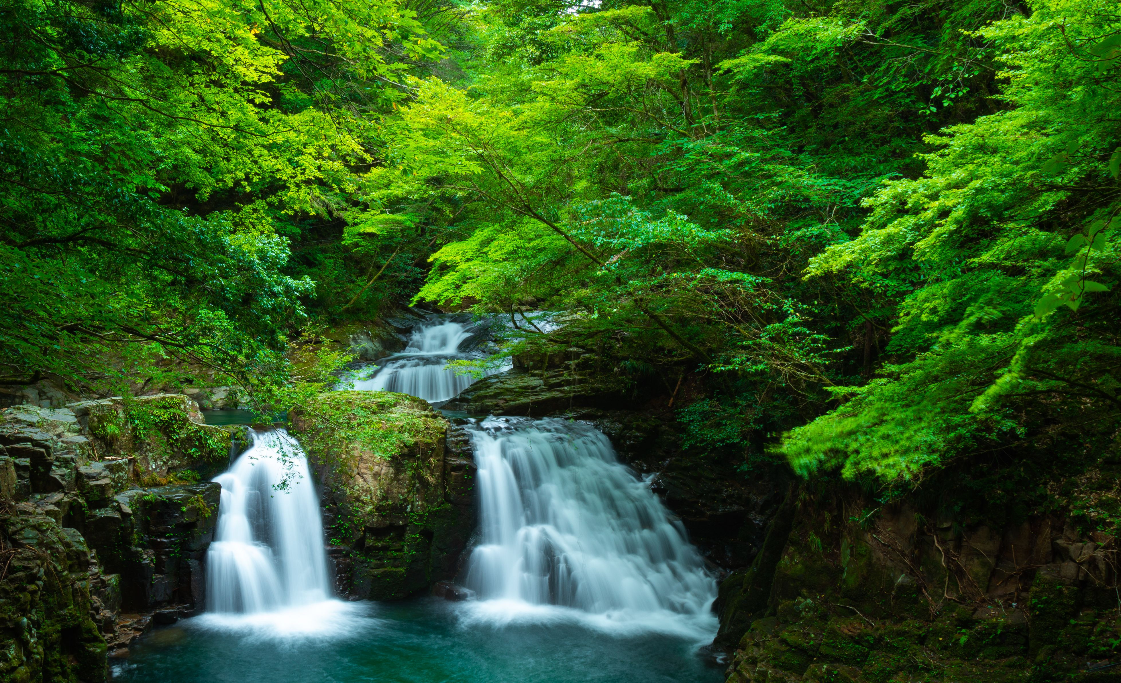 初心者による滝の写真、2枚目です。 2時間ほど歩いて、急斜面を登った所にこの風景がありました 台風の後で水量が多く放水のようでした、、 マイナスイオンどころかカメラにも水滴が。