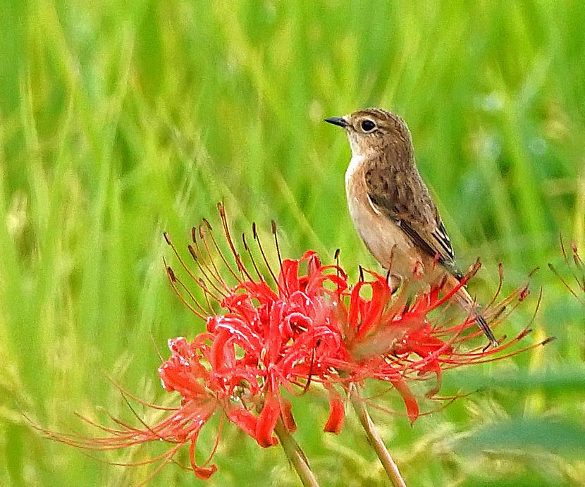 炎の様に咲いた彼岸花に#ノビタキ#が来た。