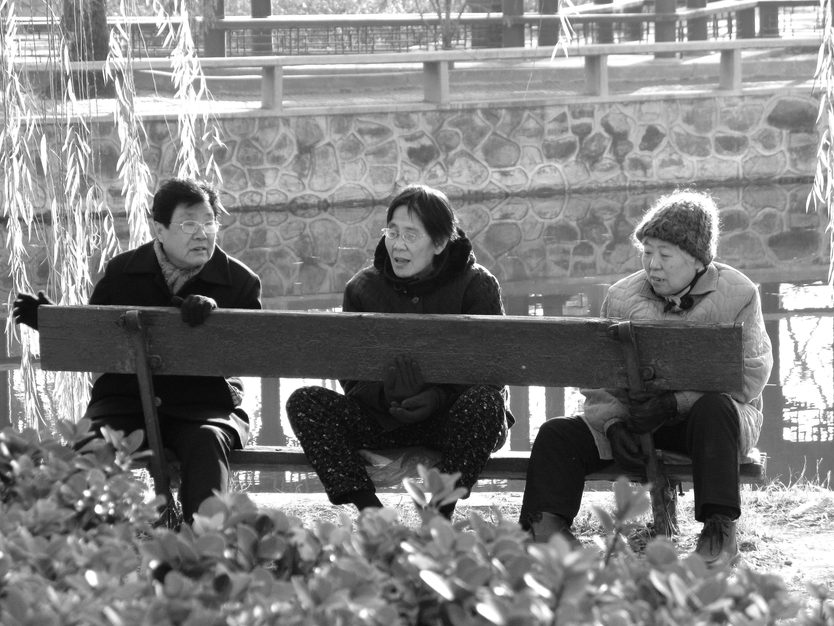 中国・天津の人民公園での光景です。 公園ではあちらこちらで語らうお年寄りを見かけます。 ベンチの背に向かって、つまり逆に腰掛ける姿が楽しげです。