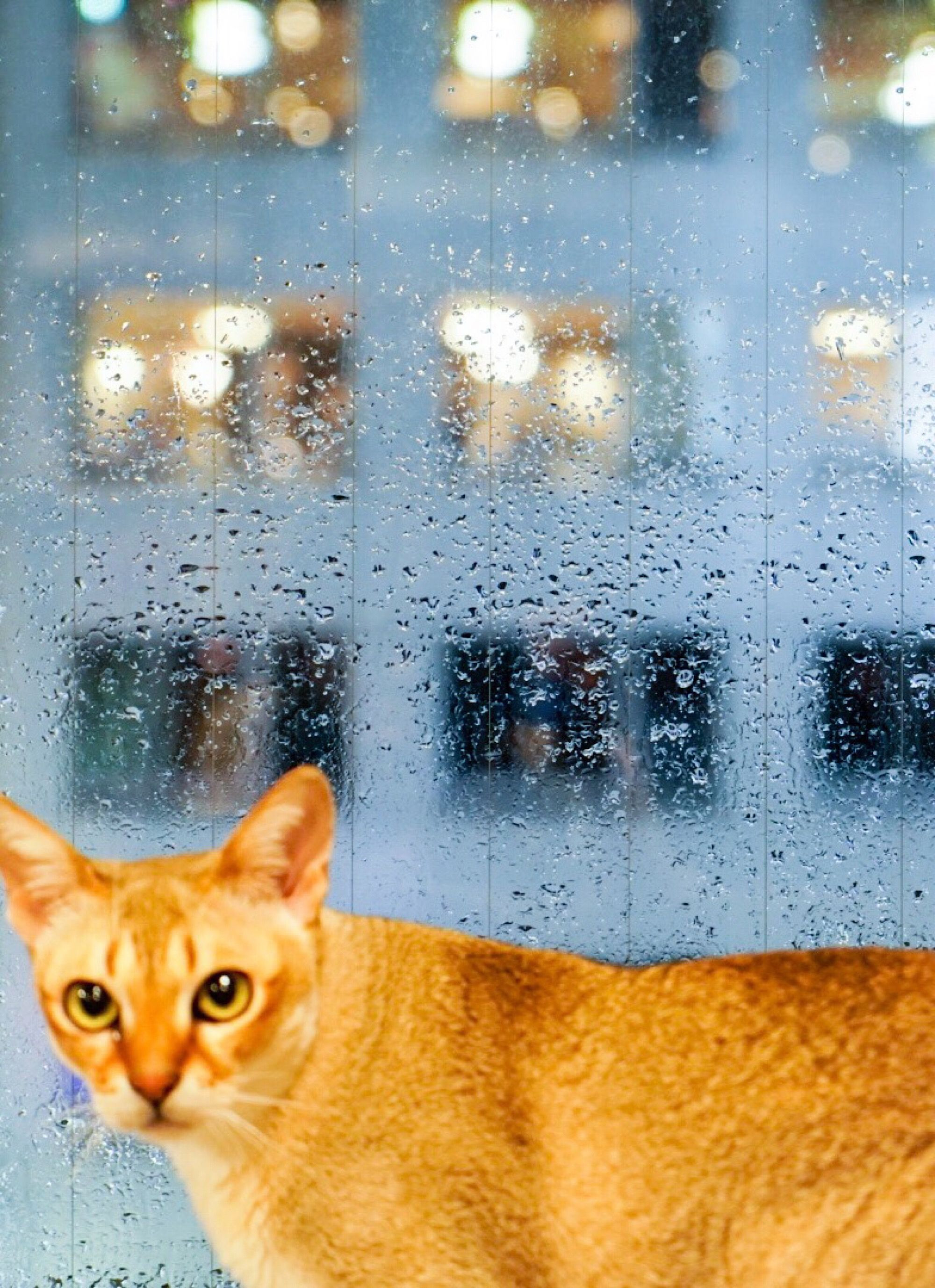 ピントが窓にあってしまいましたが、猫と雨粒フィルター越しにみた夜景がキレイでした。