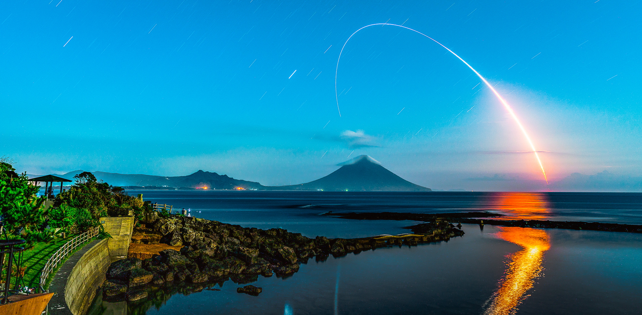 水面に映る花火と開聞岳