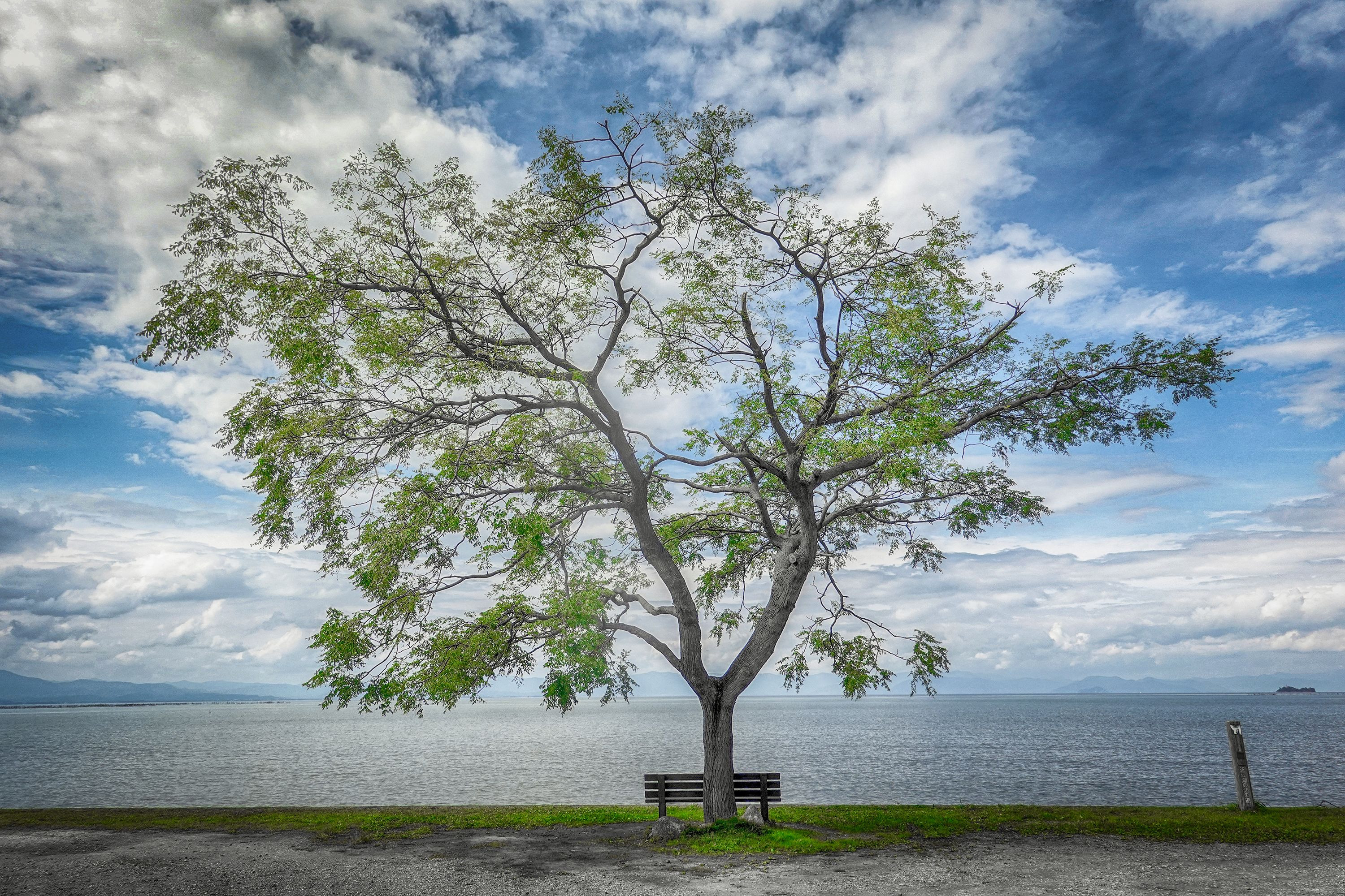 SNSで有名になった琵琶湖の「あのベンチ」 台風でかなり枝が折れました。