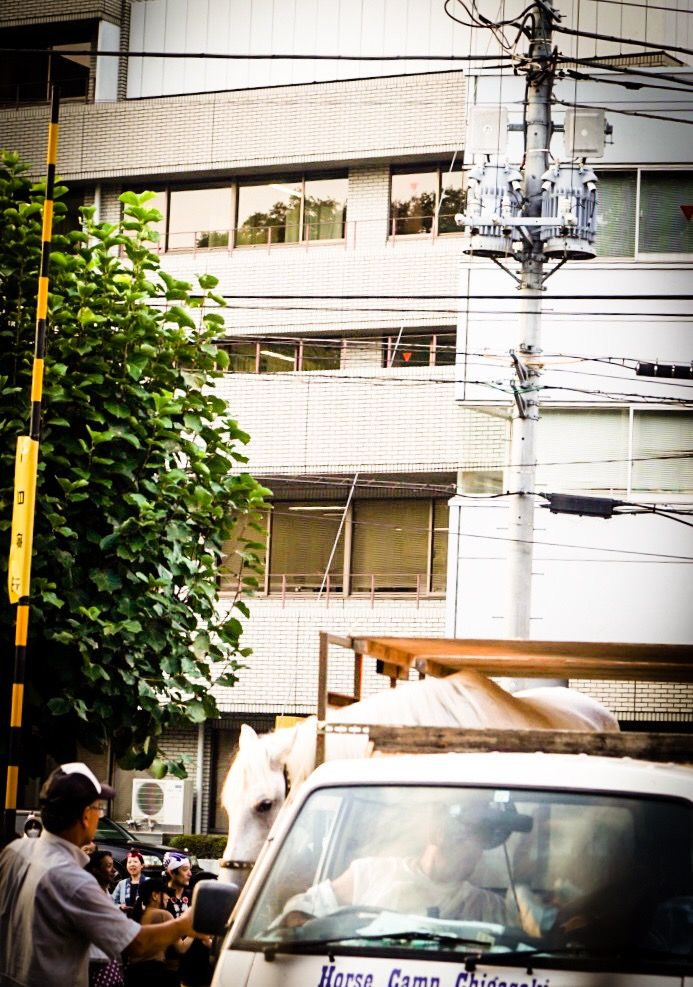 二年に一度の根津神社大祭では、馬が練り歩くそうです。 馬をレンタルされていたようで、イベント後の駐車場では、トラックに馬を乗せ、神官が馬を戻しにいこうとハンドルを切っています。 しかし、町人は、馬との交流を楽しんでいて、見守る人々も名残惜しそうにしています。 トリミングとフィルターかけをしています。