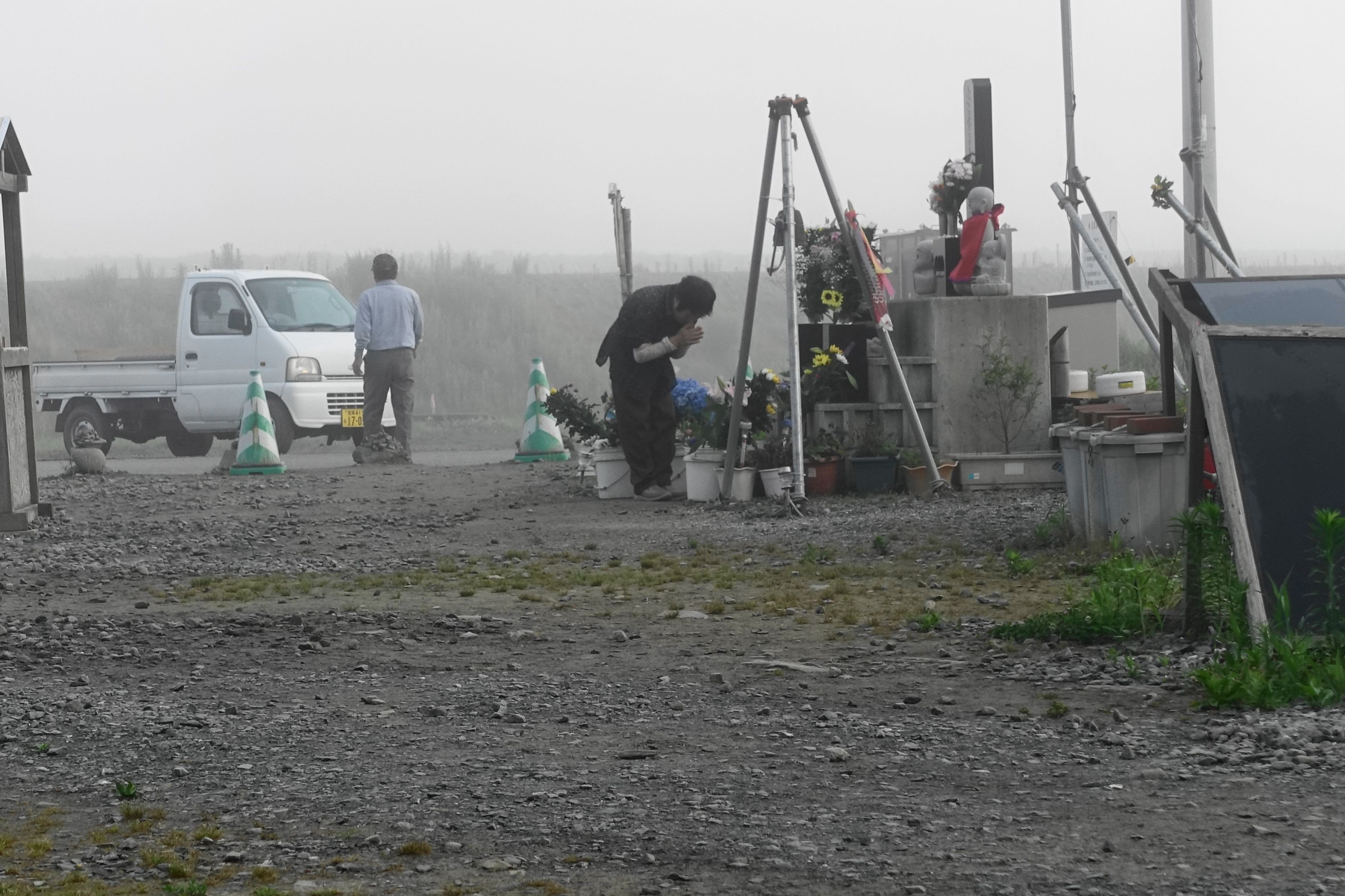 宮城県石巻市の旧大川小学校の慰霊碑にお参りする家族
