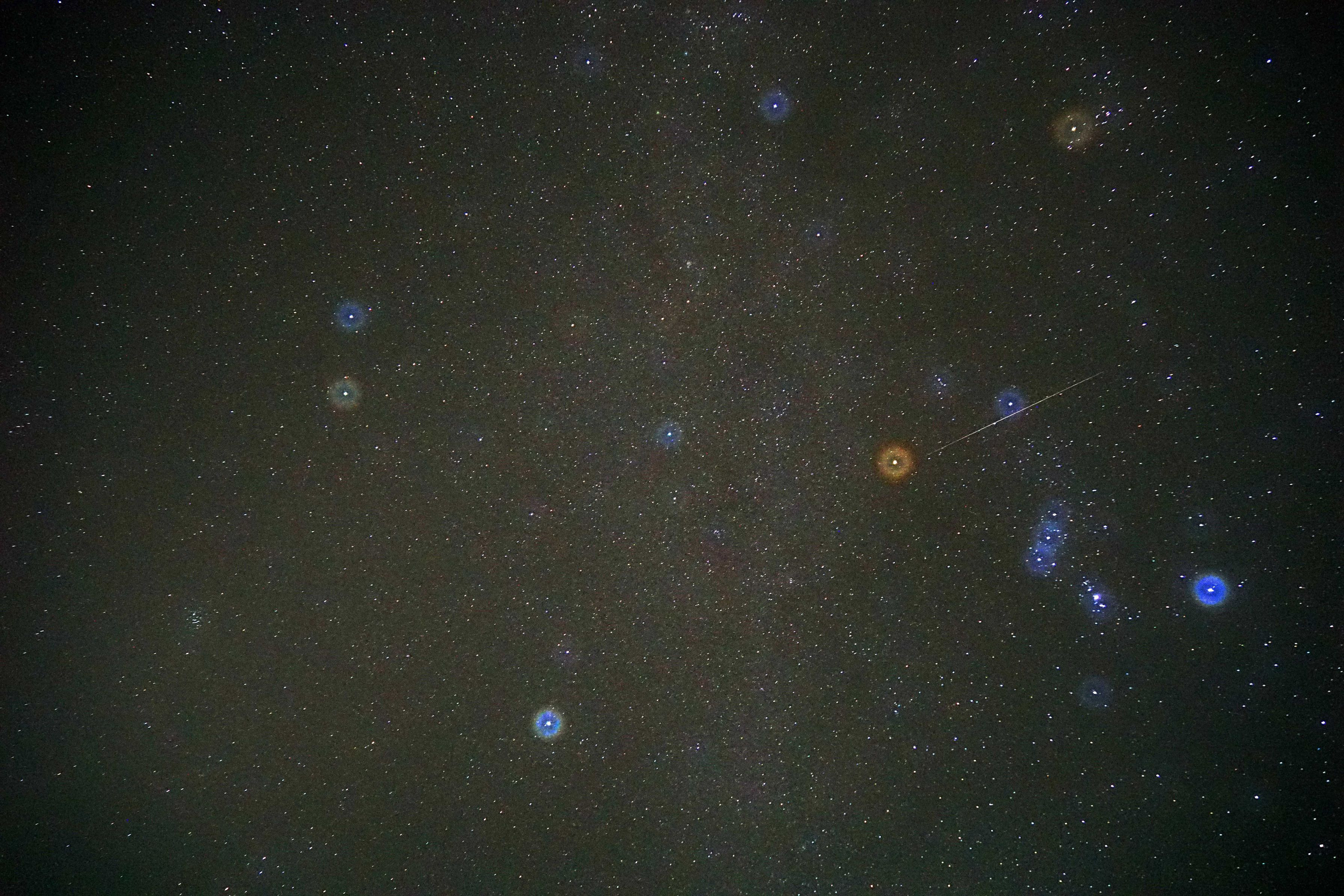 オリオン座流星群のピークは21日ですが、すでに撮影した何枚かに写っていました。 新月の前日で好条件のこの日、肉眼でもいくつか確認できました。 フィルターに夜露が着いたおかげで明るい星が滲み、色もはっきりわかります。 中央右側のオレンジ色の星がオリオン座のα星ベテルギウス。その右に流星が写りました。