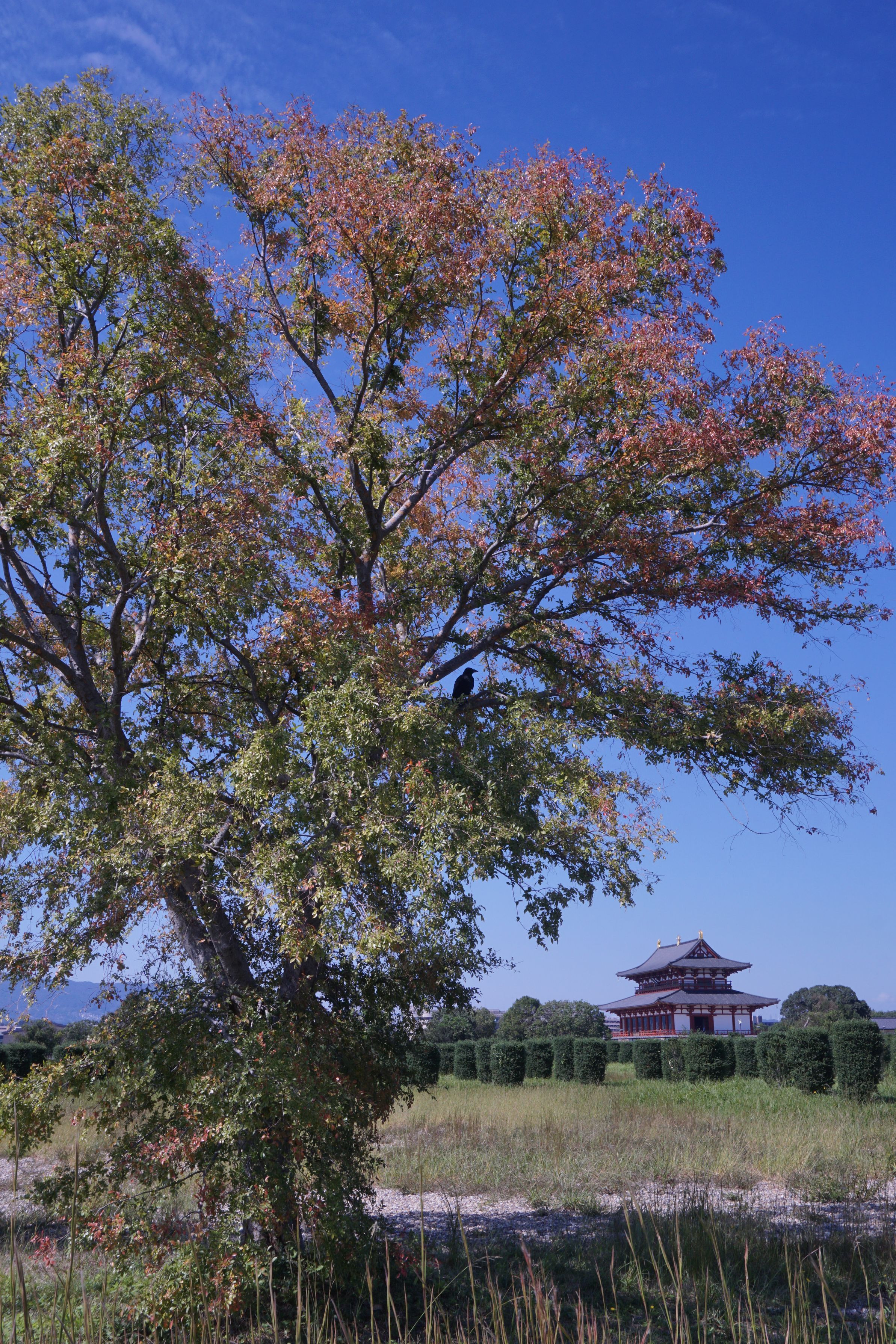 秋晴れの平城宮跡歴史公園です。遠くに第一次大極殿を撮ったつもりが珍客が静かにたたずんでいました。
