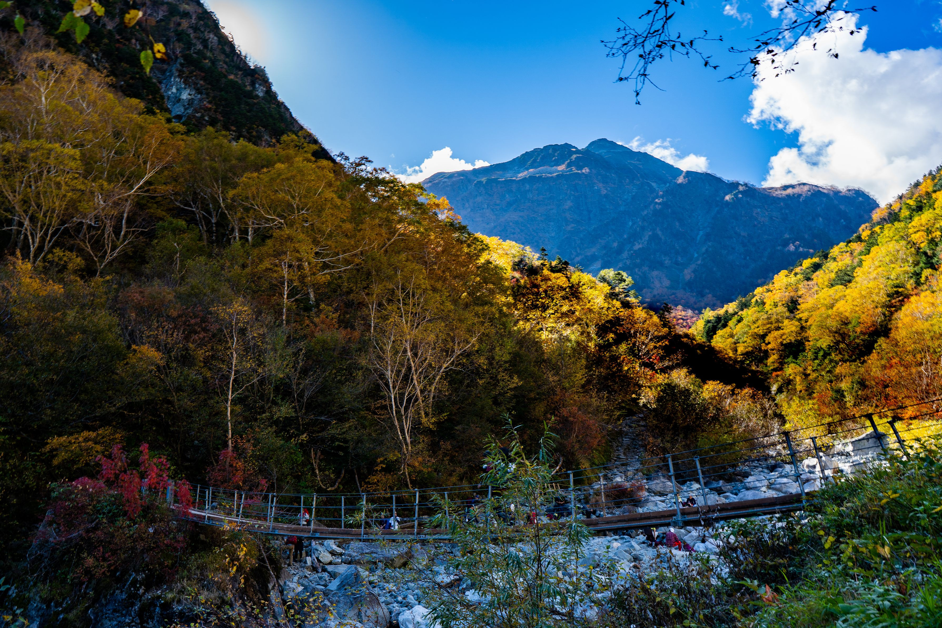 先日、上高地から涸沢まで行ってきたのですが、 本谷橋での景色が思いがけず綺麗だったので撮影。 岩場では多くの登山客がひと休みしていました。