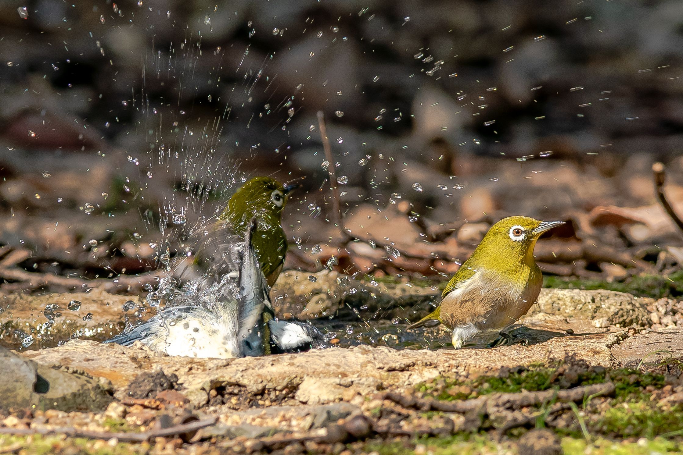 シジュウガラとメジロの水浴び