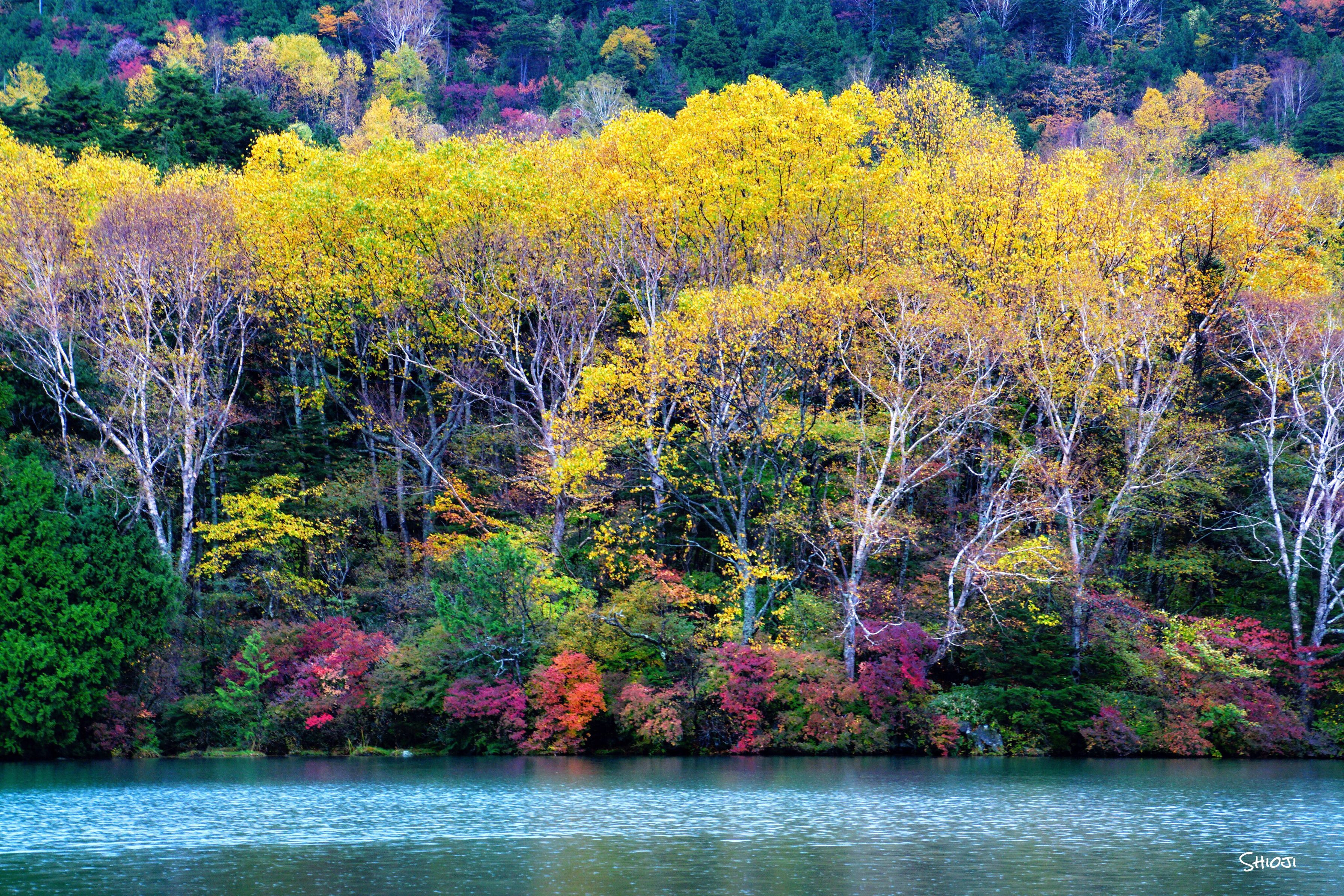 日光市 湯の湖の朝です。時々小雨が降って木々の色づきもより一層綺麗でした。
