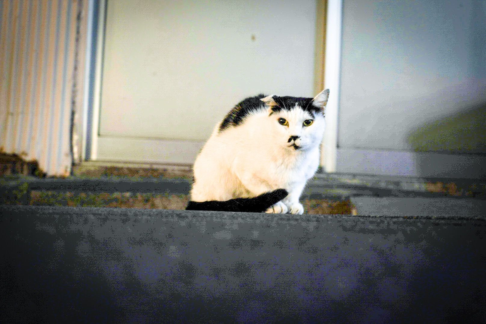 谷中銀座の長老猫が、秋夜に外で過ごされていました。 背中をかがめて、少し肌寒い様子です。 いつもは、もっと拒絶的で他人行儀な表情ですが、だいぶ慣れたのか、今日は普段より優しそうな表情をした長老でした。 シャッター音をオフにしたので、撮影に気付かれず、嫌がられなかったのかもしれません。 フラッシュなしでは真っ暗だったので、フィルターをかけて明るく調整しています。