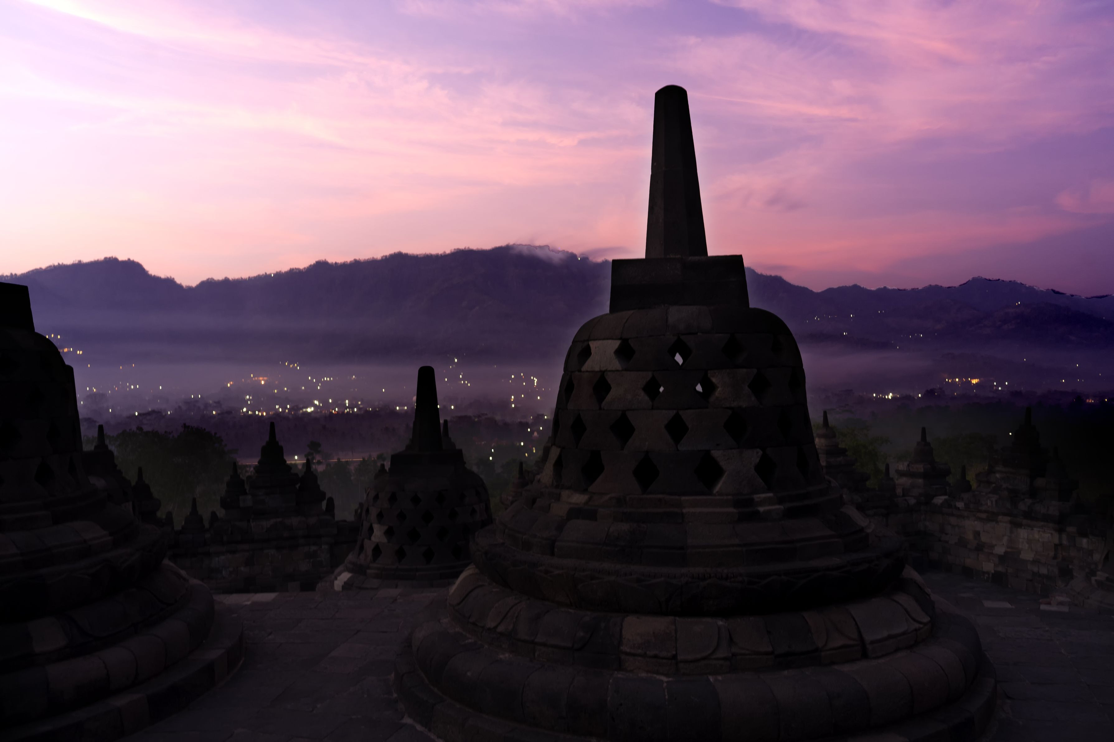 製品情報>My Sony>αcafe>ボロブドゥール寺院の朝日と界隈の街の灯(通天閣さん)