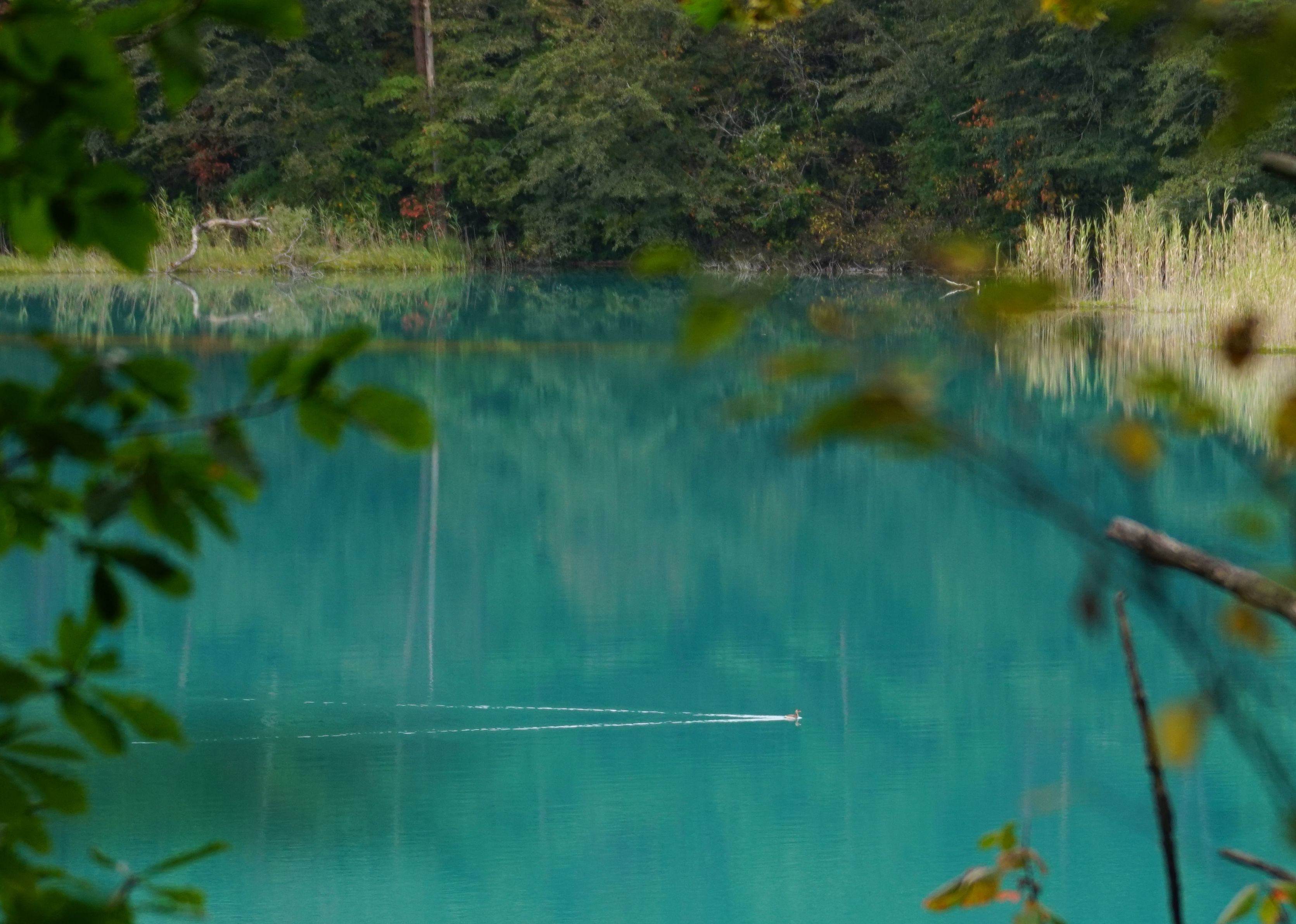 裏磐梯の五色沼、紅葉はまだ早かったのですがカモが一羽どこに行くのかな