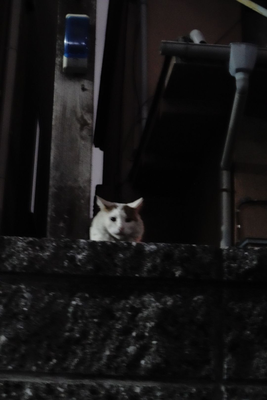ふと眺めると、塀の上に猫がいて様子を伺っていました。普通に撮ろうとすると、15秒以上かかる真っ暗闇だったので、電子シャッターでの最大ISOにあげマニュアルで撮りました。 近所迷惑を考えシャッター音を消し、AF補助光を消したためか、ピントに限界がありましたが、カメラの力で撮れました。 別の猫が道路にせり出した蔦でターザンをするシャッターチャンスは、早すぎて撮れませんでした。